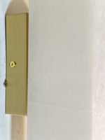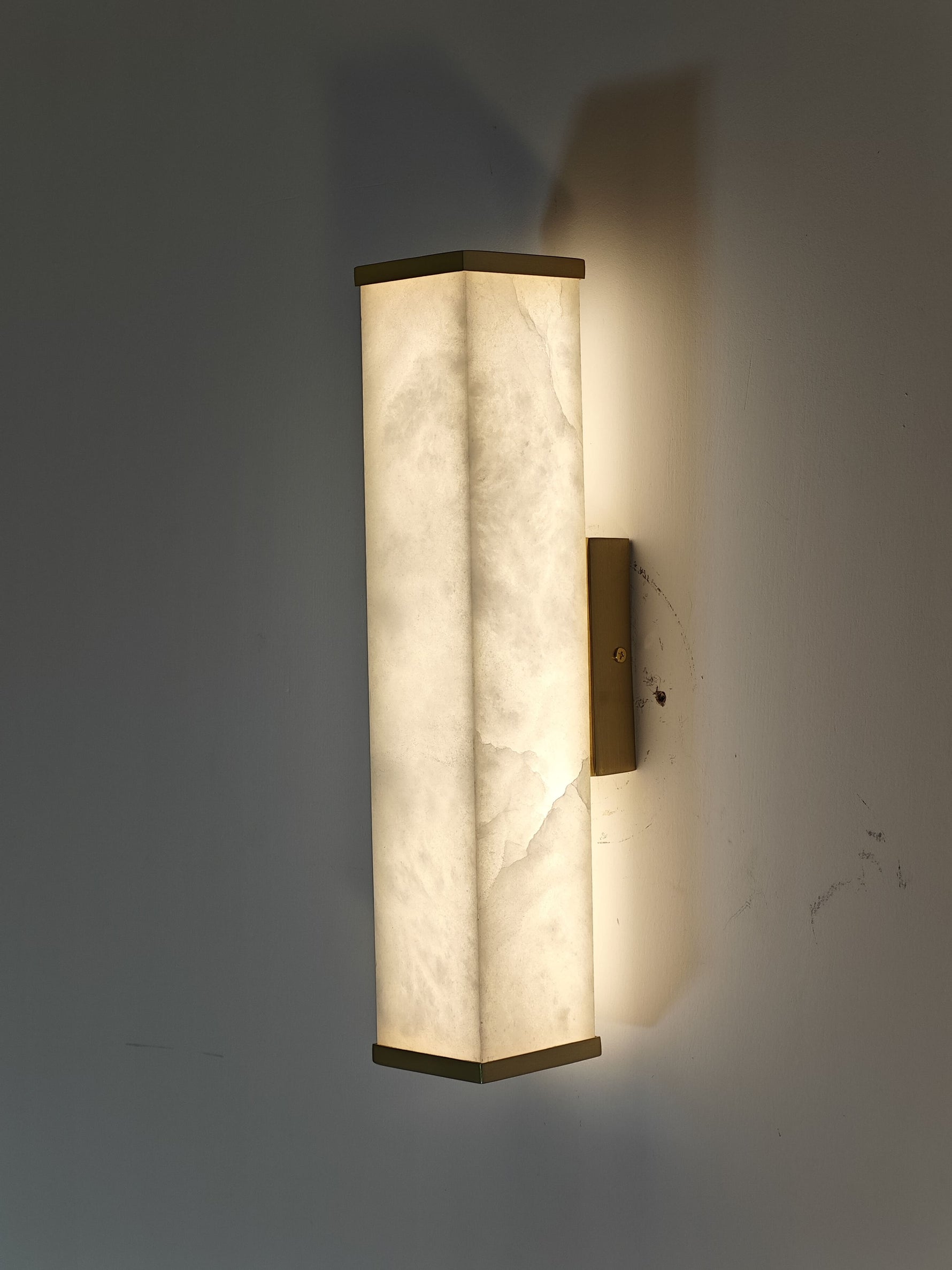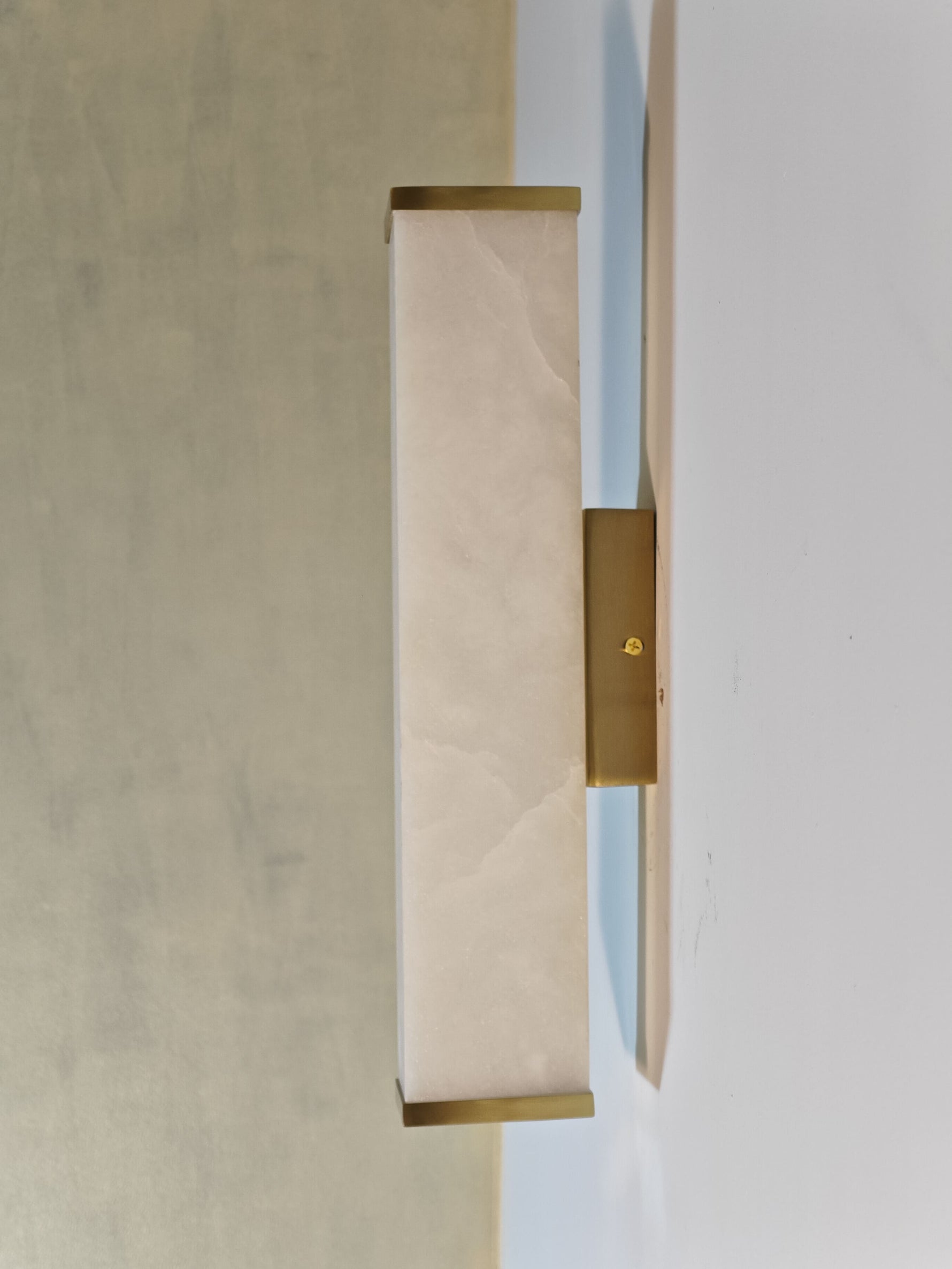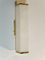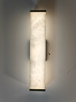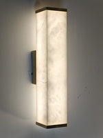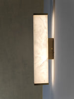 - The Moore Alabaster Wall Sconce features a single, beautiful rectangular slab of genuine alabaster that serves as the diffuser. When illuminated, the stone's delicate, natural veining and soft translucency create a warm, inviting glow, making every piece genuinely unique. Minimalist brass components—expertly polished or finished—anchor the alabaster to the wall, adding a subtle yet sophisticated touch of luxury that beautifully complements the stone's organic texture.
