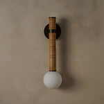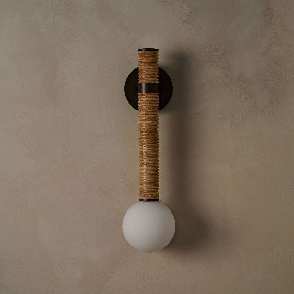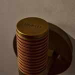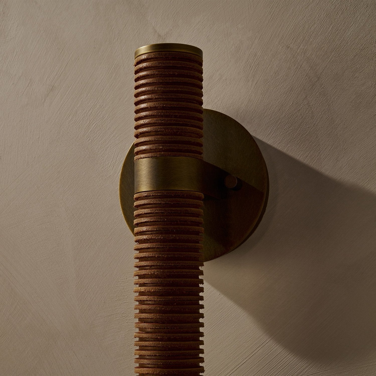 - Introducing the Pei Wall Sconce, where minimalist design meets organic texture. This striking fixture transforms raw, natural materials into a piece of functional art for your wall. Featuring stacked leather disks and a sleek cylindrical form, the Pei casts a warm, ambient glow that enhances any space with understated sophistication.