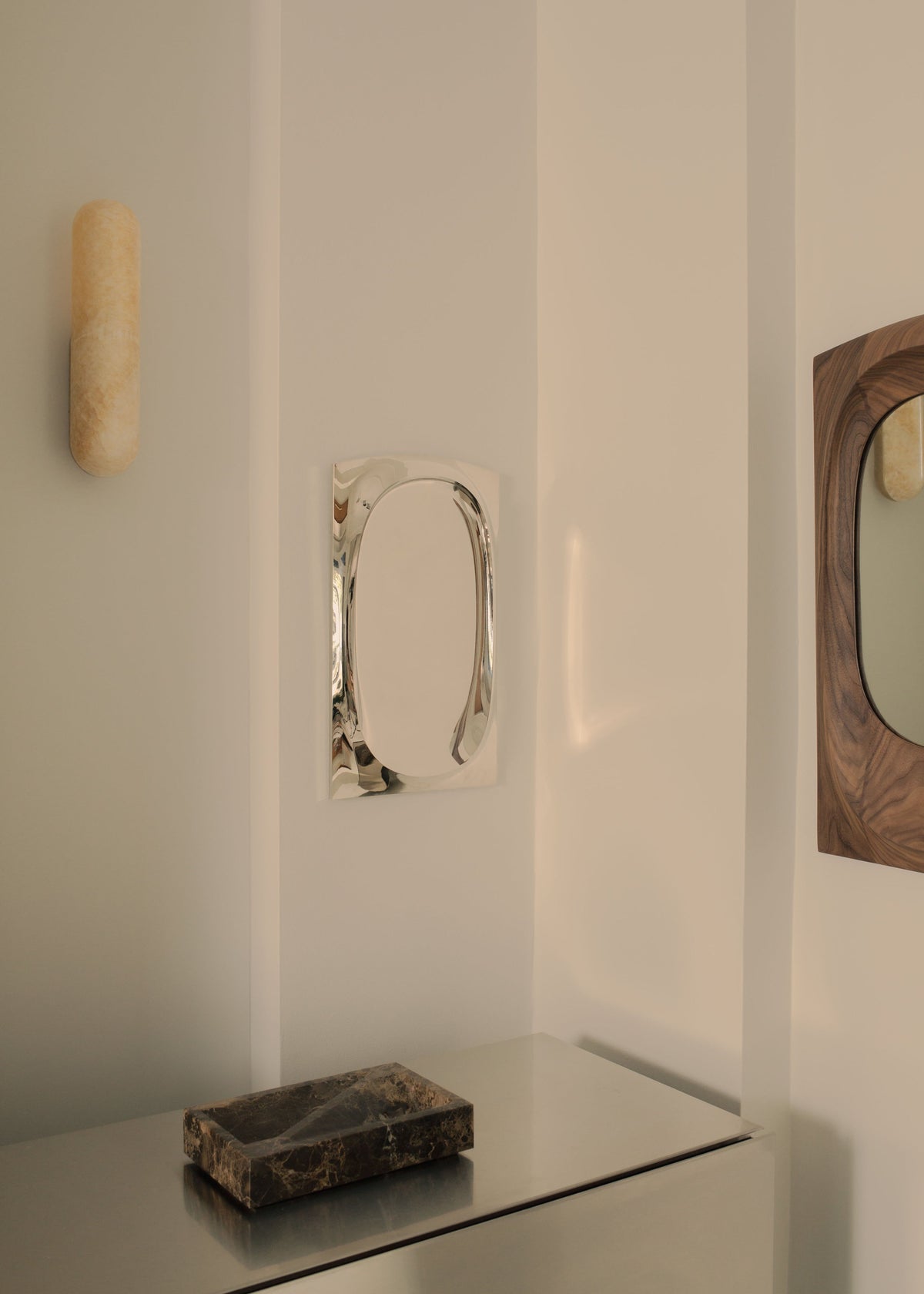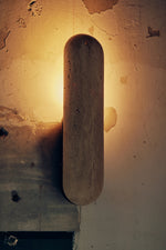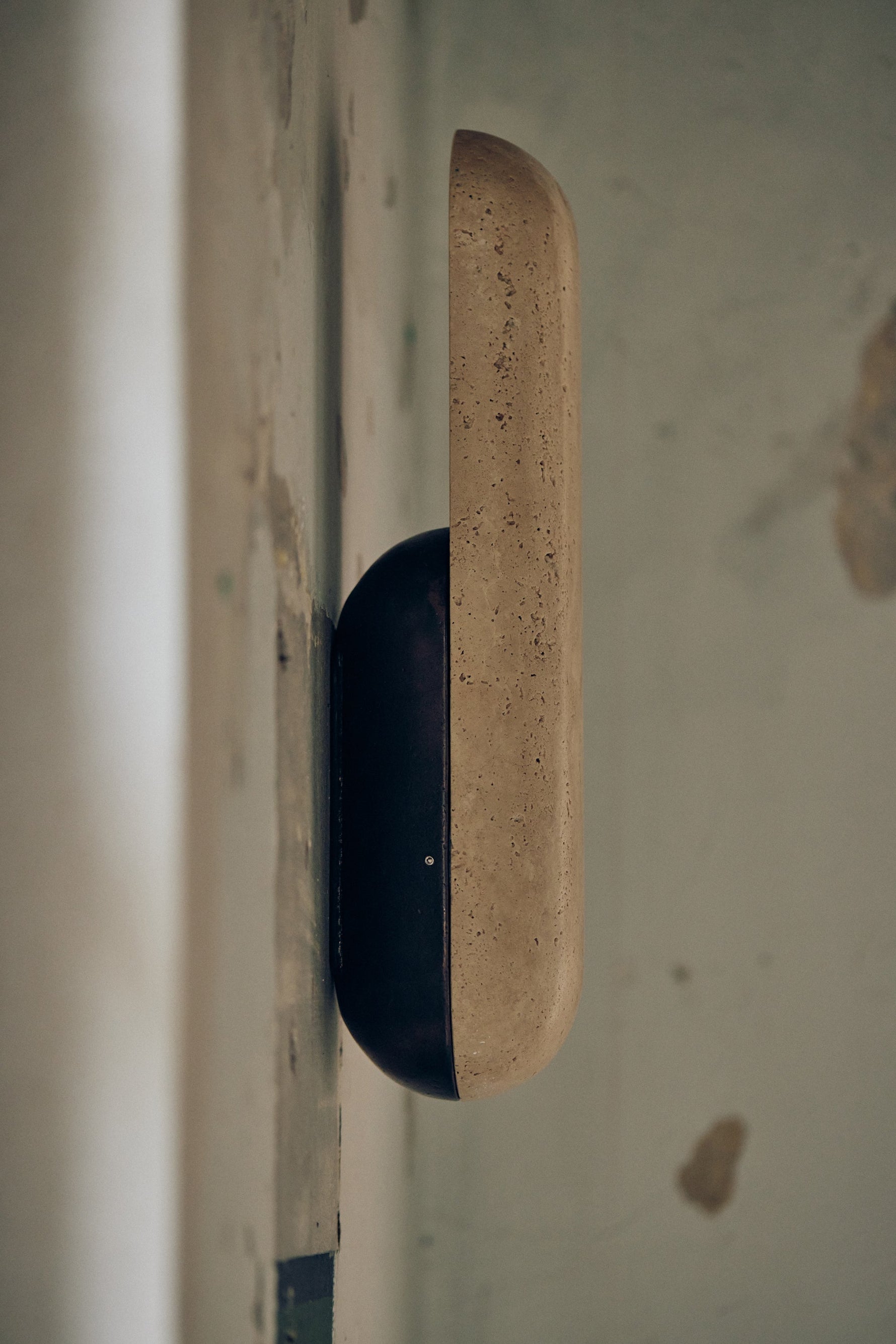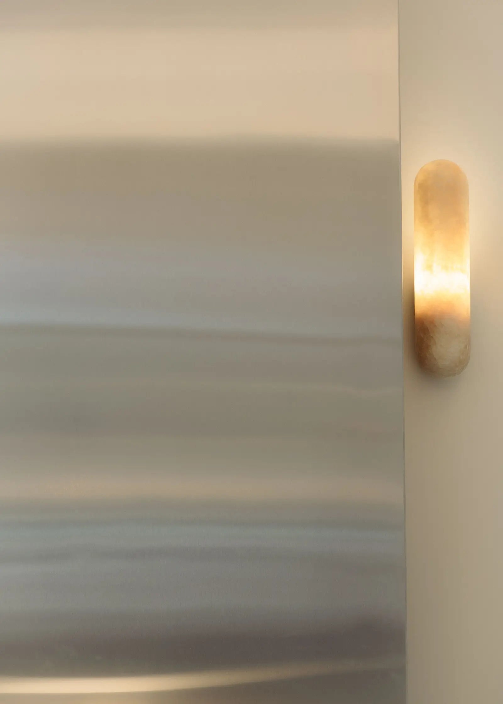 - At the heart of Pill Sconce's design is a compelling juxtaposition. A sleek, elliptical facade of solid stone is suspended before a deeply concave dish of bronze. Sandwiched between them, your chosen E26 or E27 bulb (not included) becomes the heart of the performance.