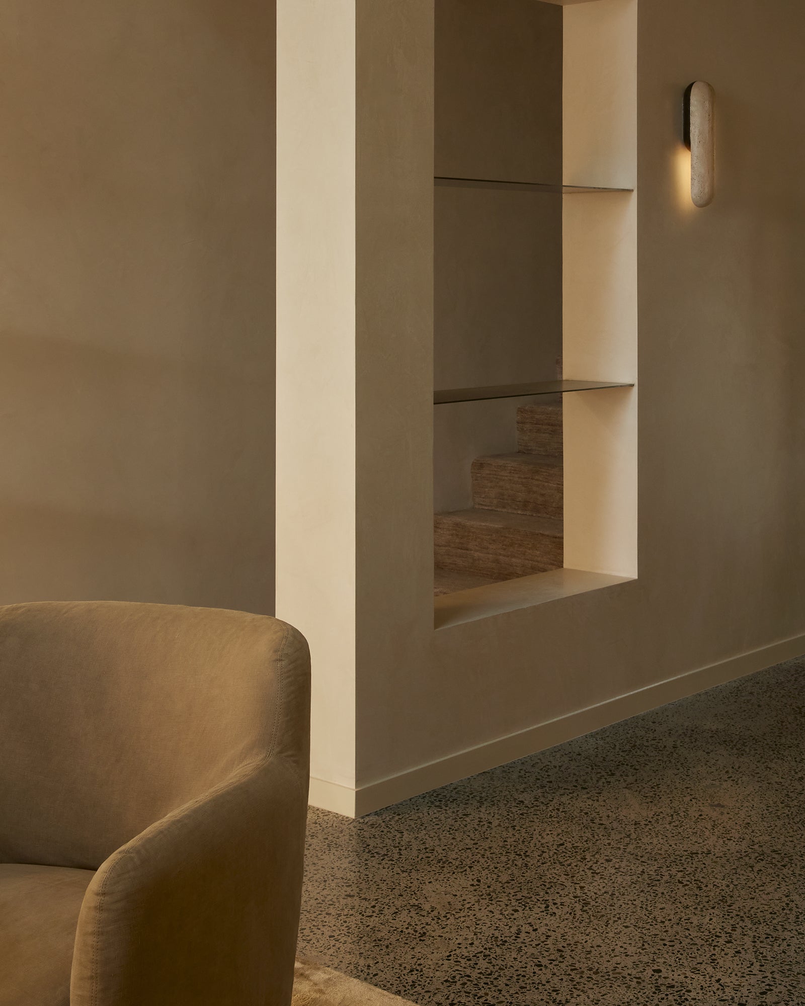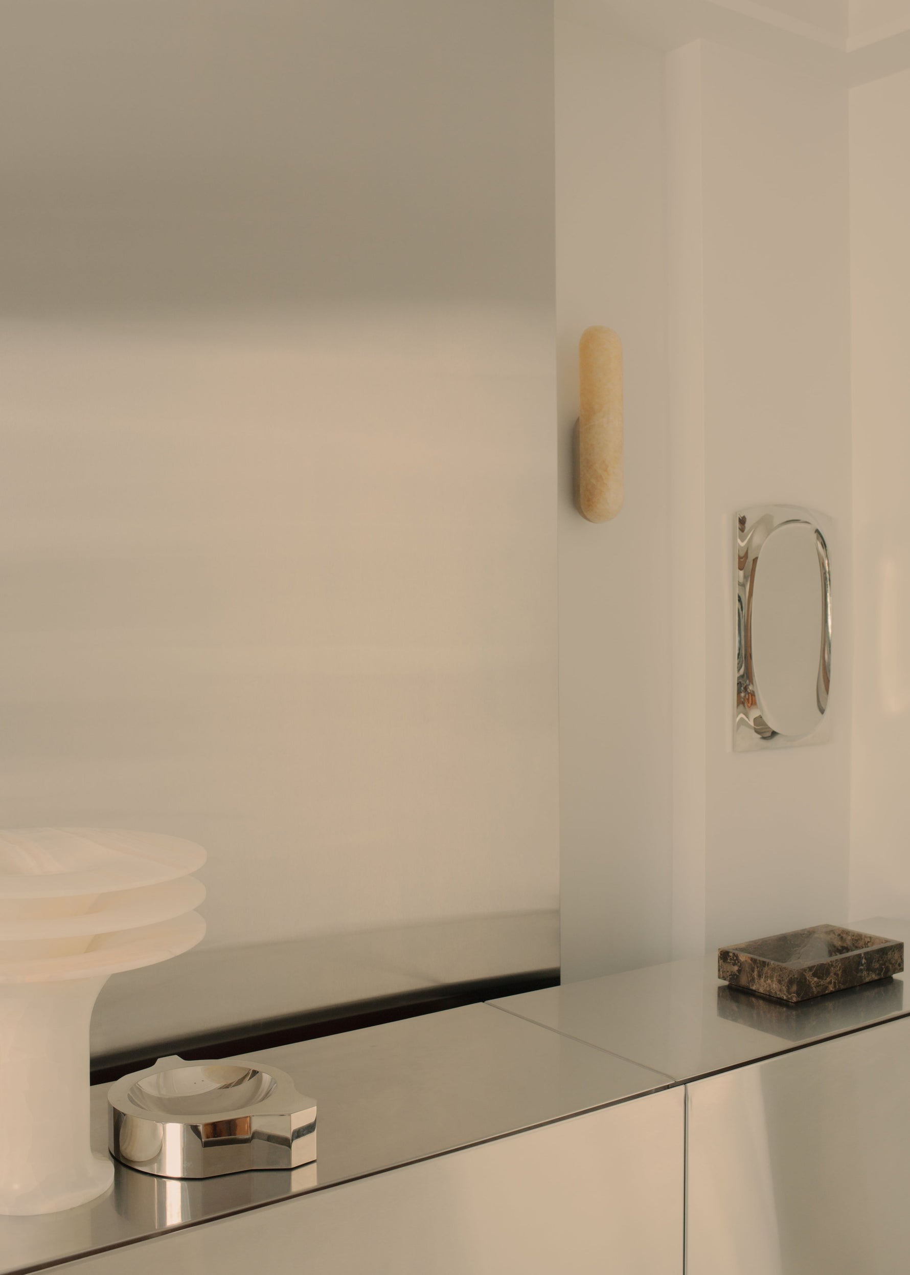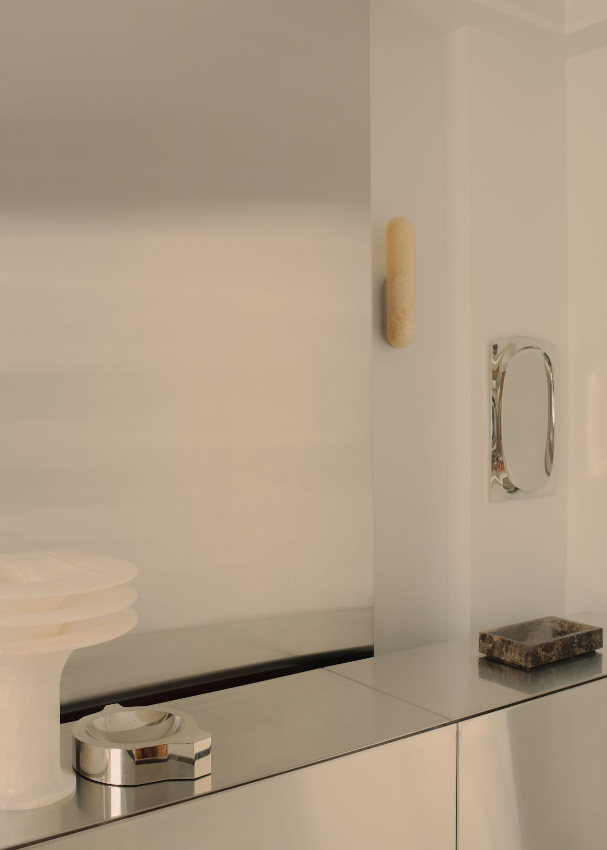 - At the heart of Pill Sconce's design is a compelling juxtaposition. A sleek, elliptical facade of solid stone is suspended before a deeply concave dish of bronze. Sandwiched between them, your chosen E26 or E27 bulb (not included) becomes the heart of the performance.