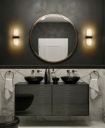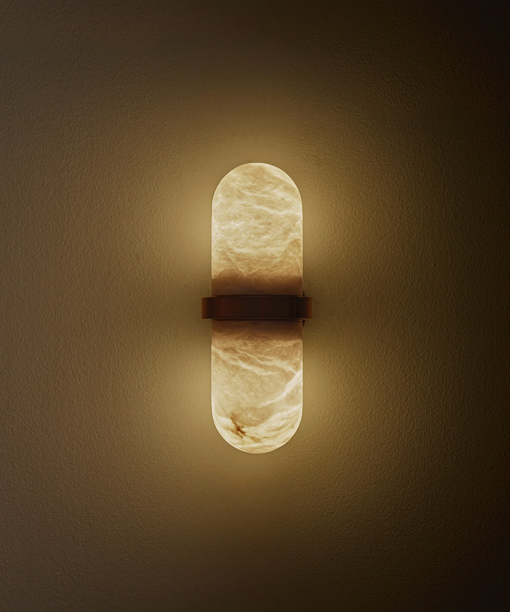 - The Pill Wall Sconce's elegant design is defined by two opposing cylinders of exquisite alabaster, gracefully joined by a slender, burnished brass ring. This brass element is not merely a decorative detail; it is the intelligent structural support, creating a visually lightweight and sophisticated profile.
