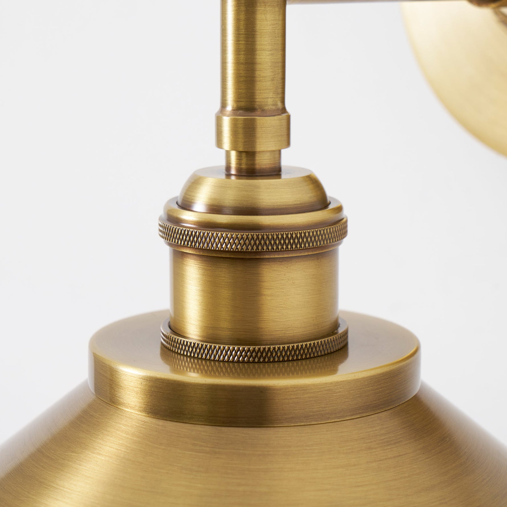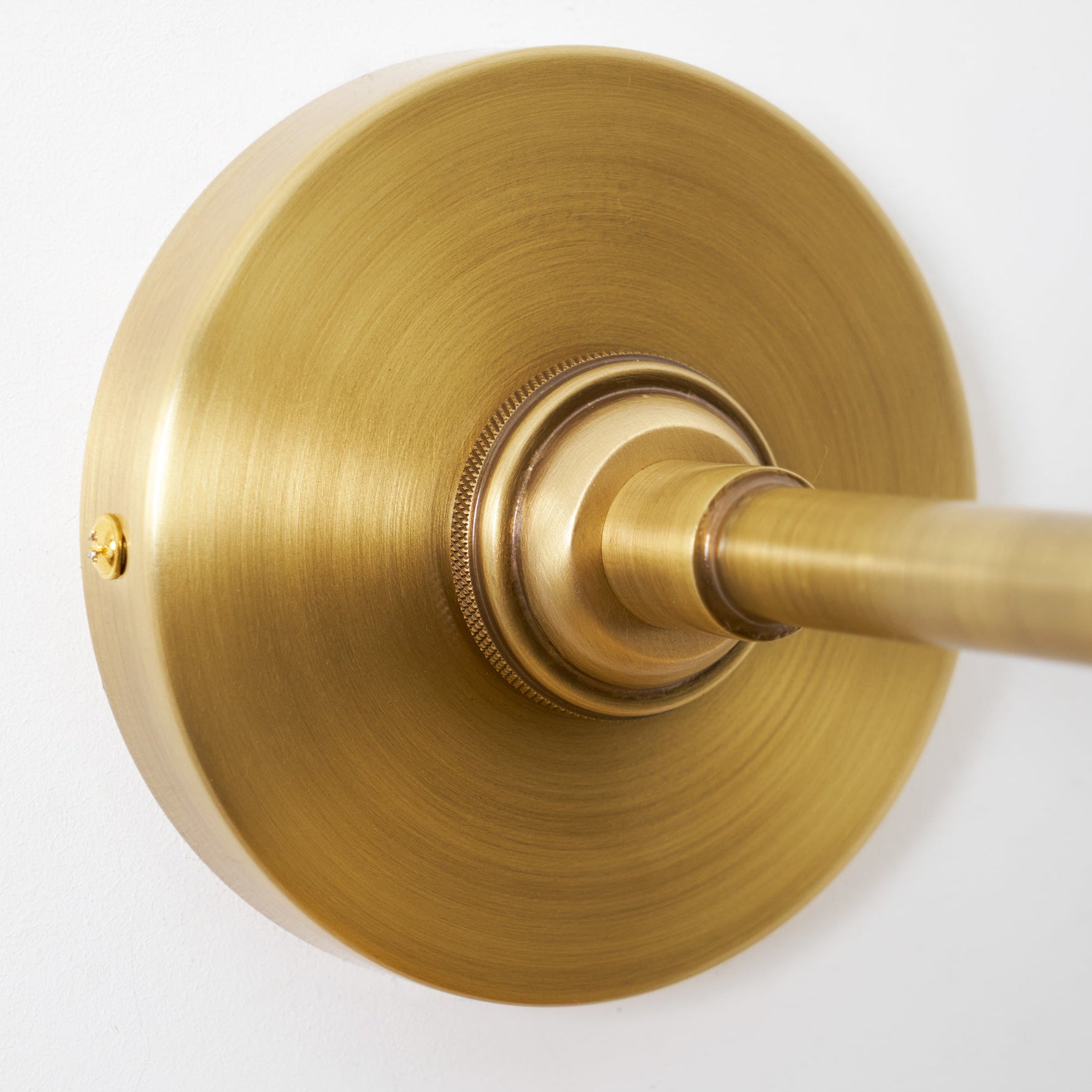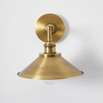 - Bask in the warm, atmospheric glow of the Polak Wall Sconce, where industrial minimalism meets the soulful depth of vintage character. This isn't merely a lighting fixture; it's a dynamic sculpture for your wall, designed to evolve and mature within your space. Meticulously crafted from unlacquered solid brass, its journey begins with a naturally soft sheen and deepens over time, acquiring a unique patina that tells the story of your home.