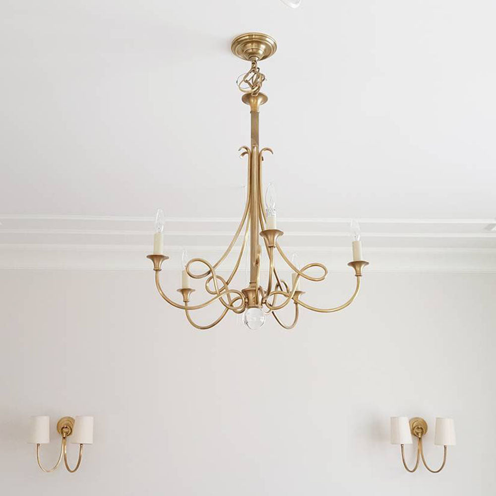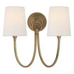 - The elegant brass arms are crowned with soft, neutral linen shades. These carefully selected shades work to gently diffuse light, eliminating harsh glares and casting a warm, inviting glow. Perfect for creating a tranquil and comfortable atmosphere where you can truly unwind after a long day.