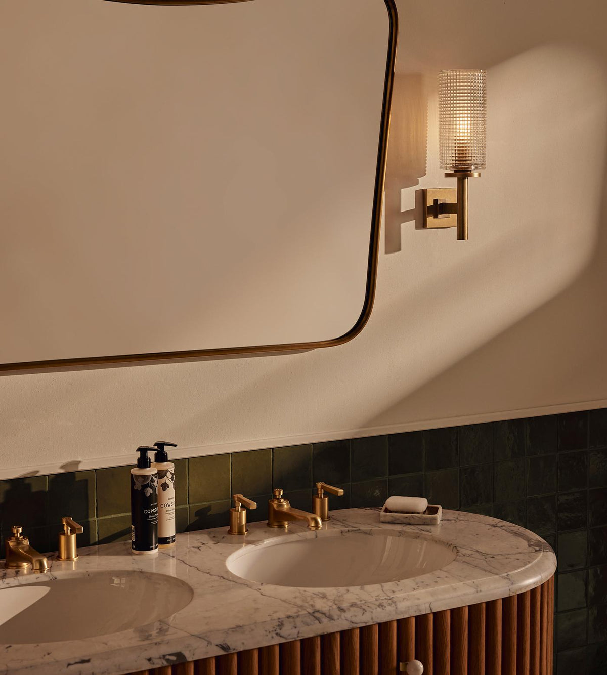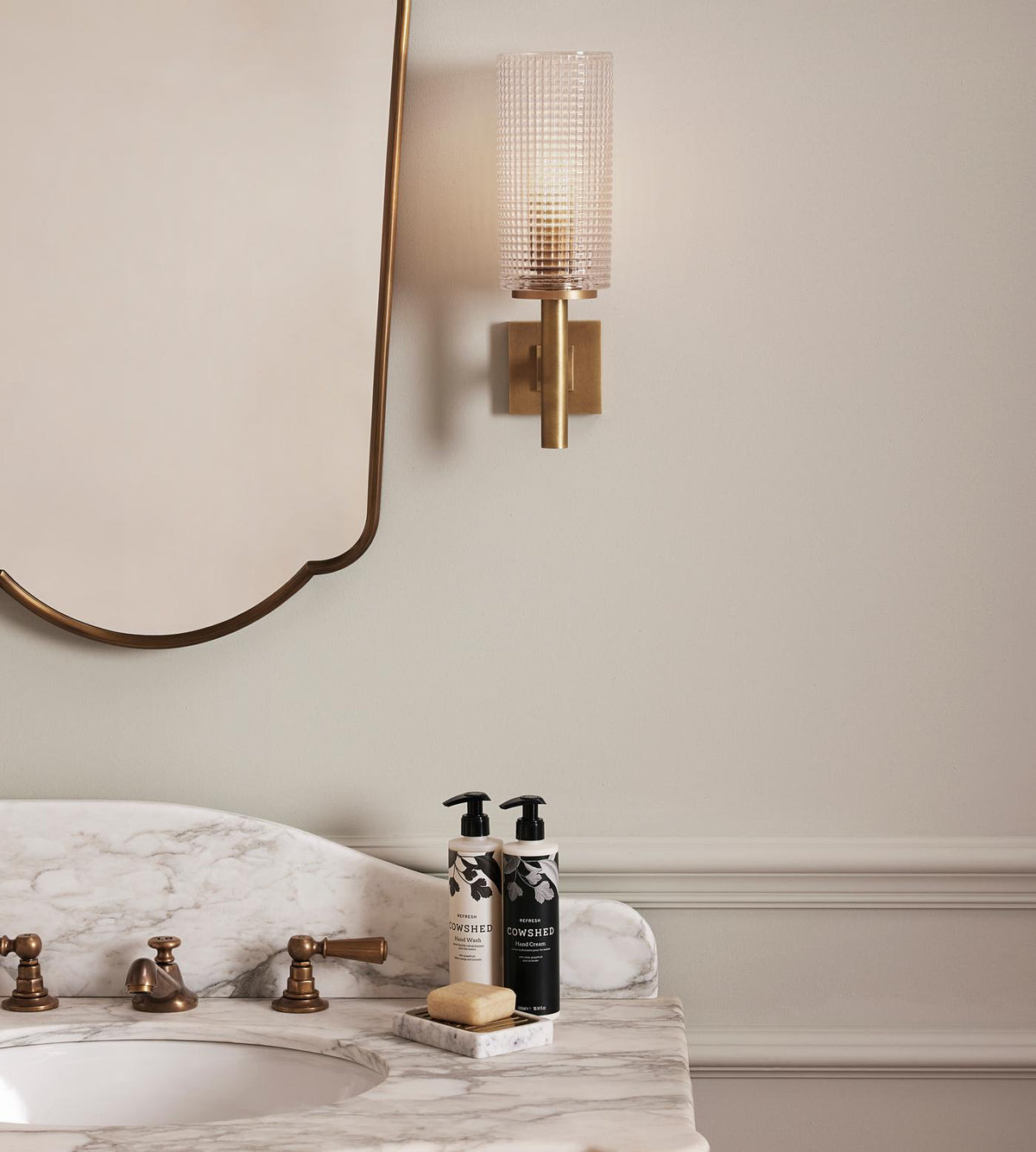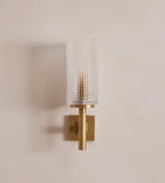 - Crafted for those who appreciate the details, Skye Wall Sconce boasts a robust arm with distinctive ribbed detailing, rendered in solid antique brass. This choice of material and finish ensures a rich, vintage character that develops a unique patina over time, telling its own story in your home.