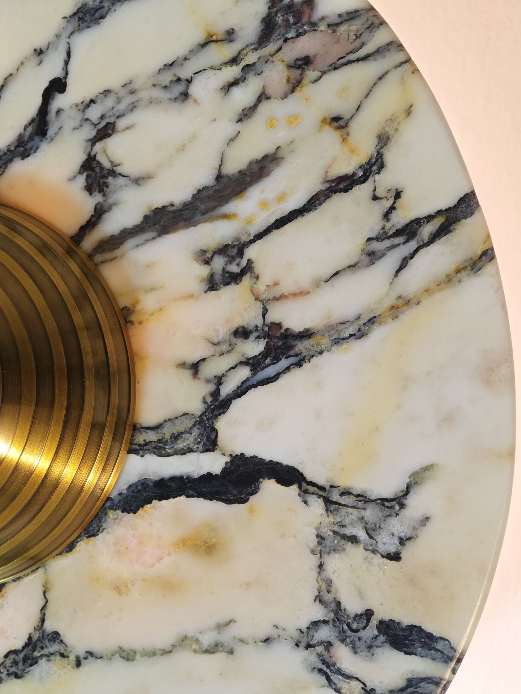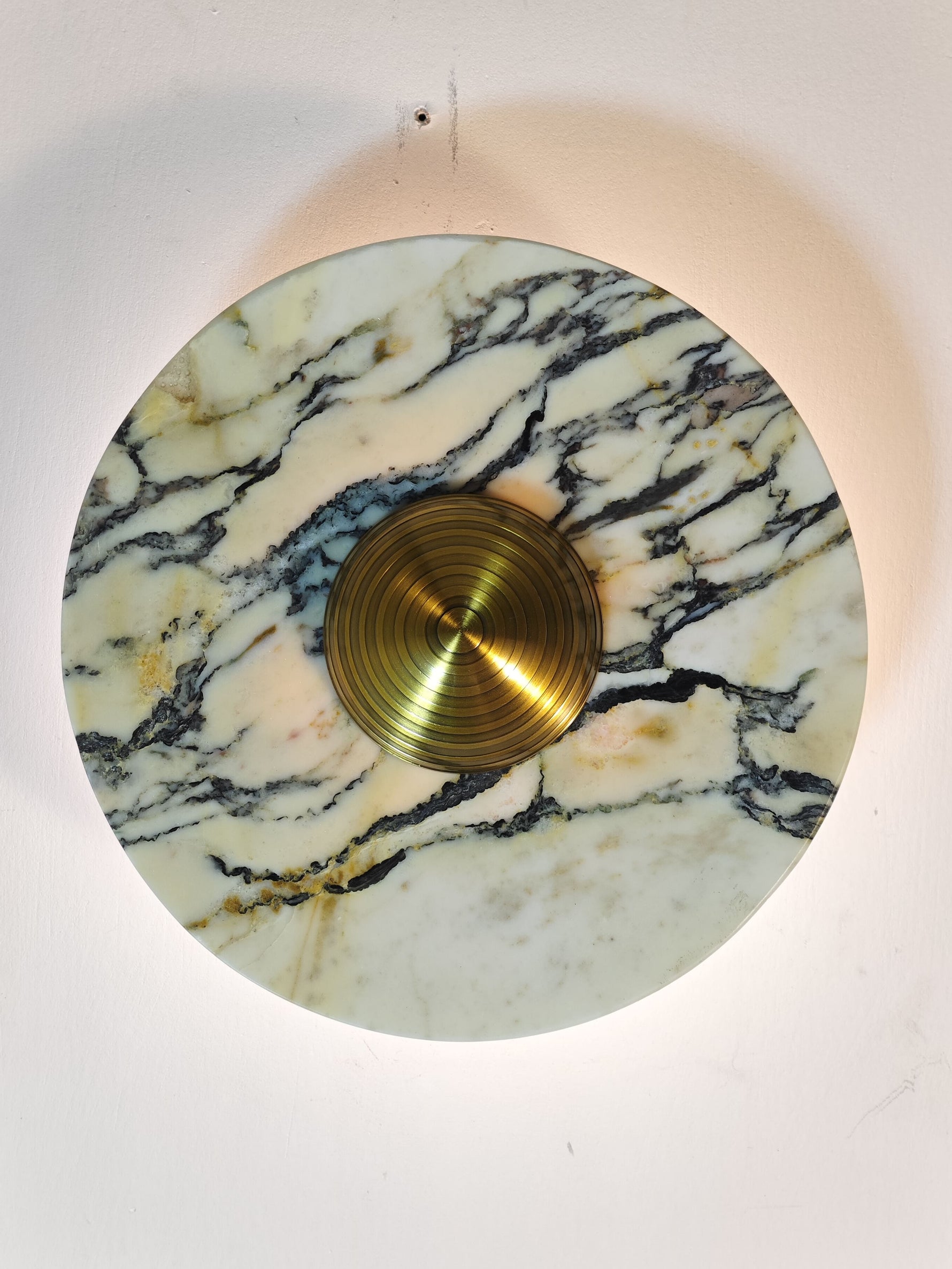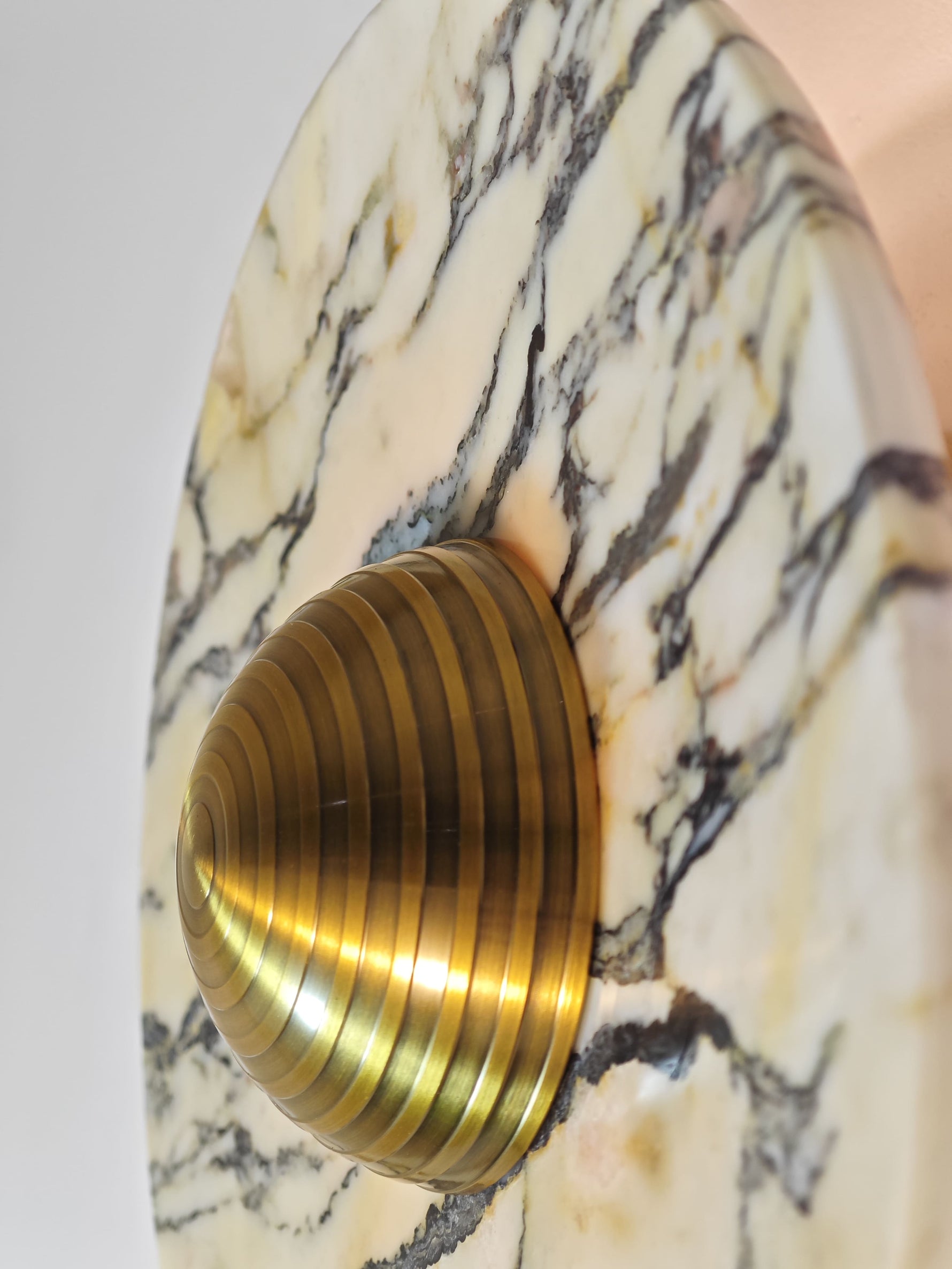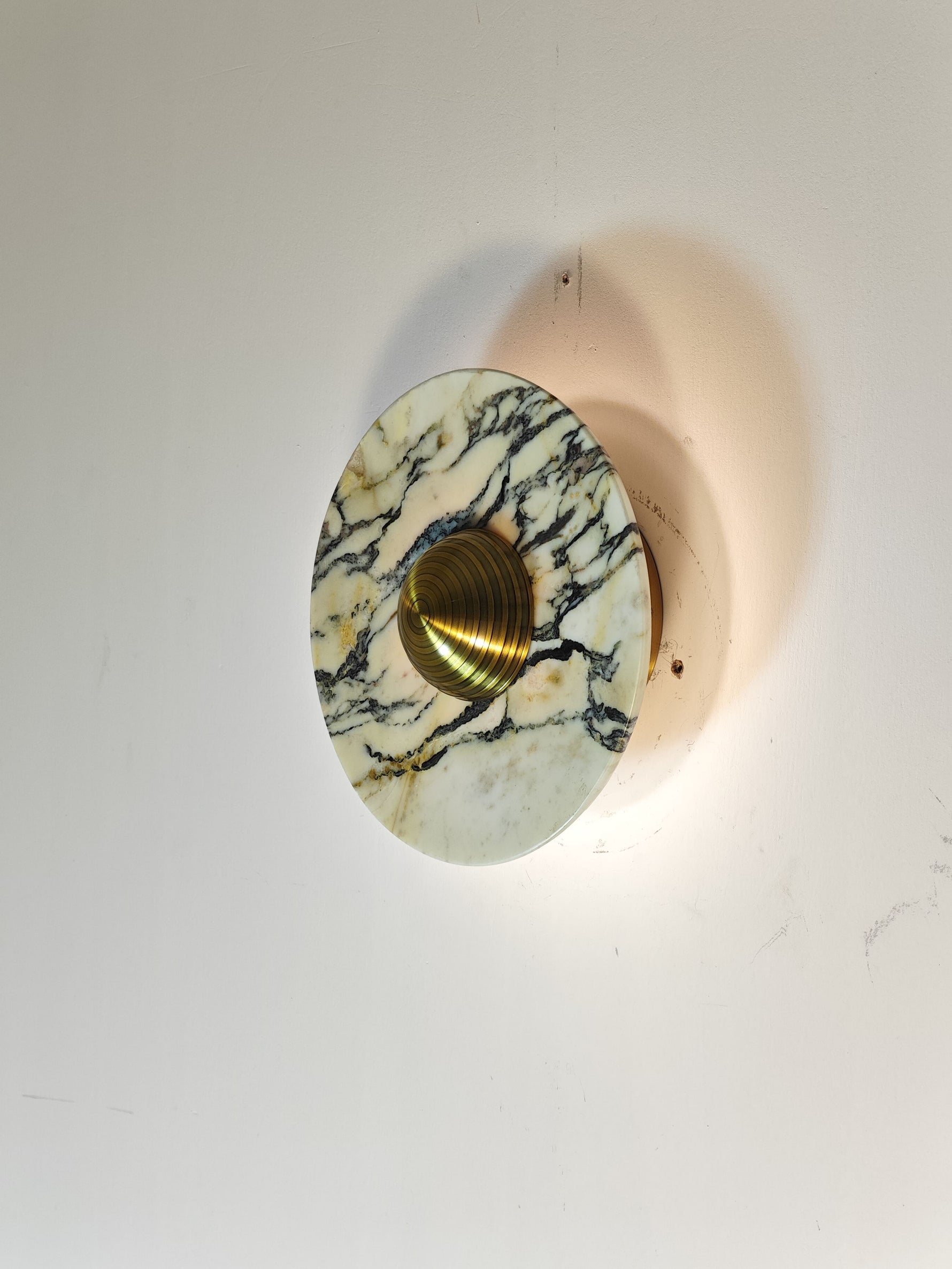 - Illuminate your space with the exquisite Calacatta Oro Round Sconce, a stunning fusion of luxury and craftsmanship. Each sconce features a diffuser crafted from premium Calacatta Oro marble, sourced from one of Italy’s oldest and most revered quarries. The marble showcases a pristine white background adorned with rich golden-beige veining, creating a striking natural pattern that adds sophistication to any room.
