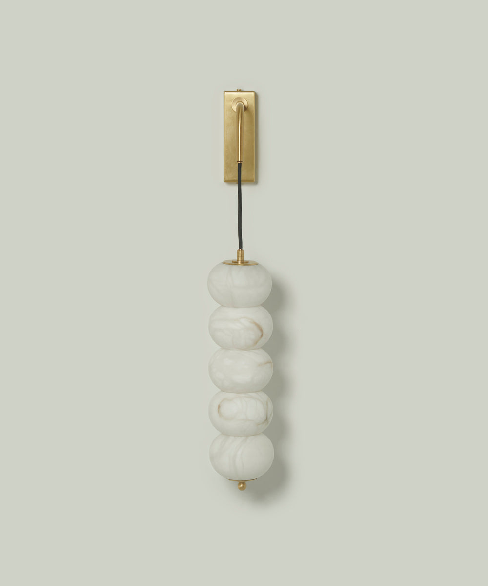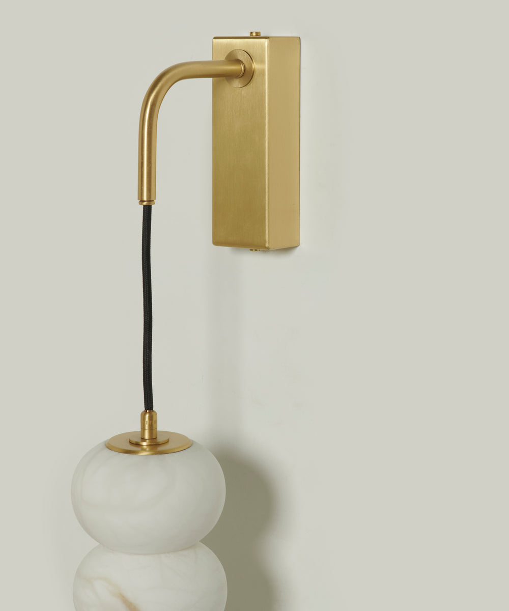 - Supporting this organic sculpture is a wall-mounted base defined by its essential, clean lines, crafted from satin brass. The choice of satin brass provides a warm, refined gleam that complements the soft, creamy hues of the alabaster without overpowering it. This deliberate contrast between the minimalist, structured metal and the soft, complex texture of the stone is a core tenet of its design. Furthermore, the visible cord and subtle brass details are not merely functional elements; they are intentional design statements. They introduce a discreet yet distinctive touch of industrial modernity, framing the composition and ensuring the sconce feels both timeless and perfectly contemporary.