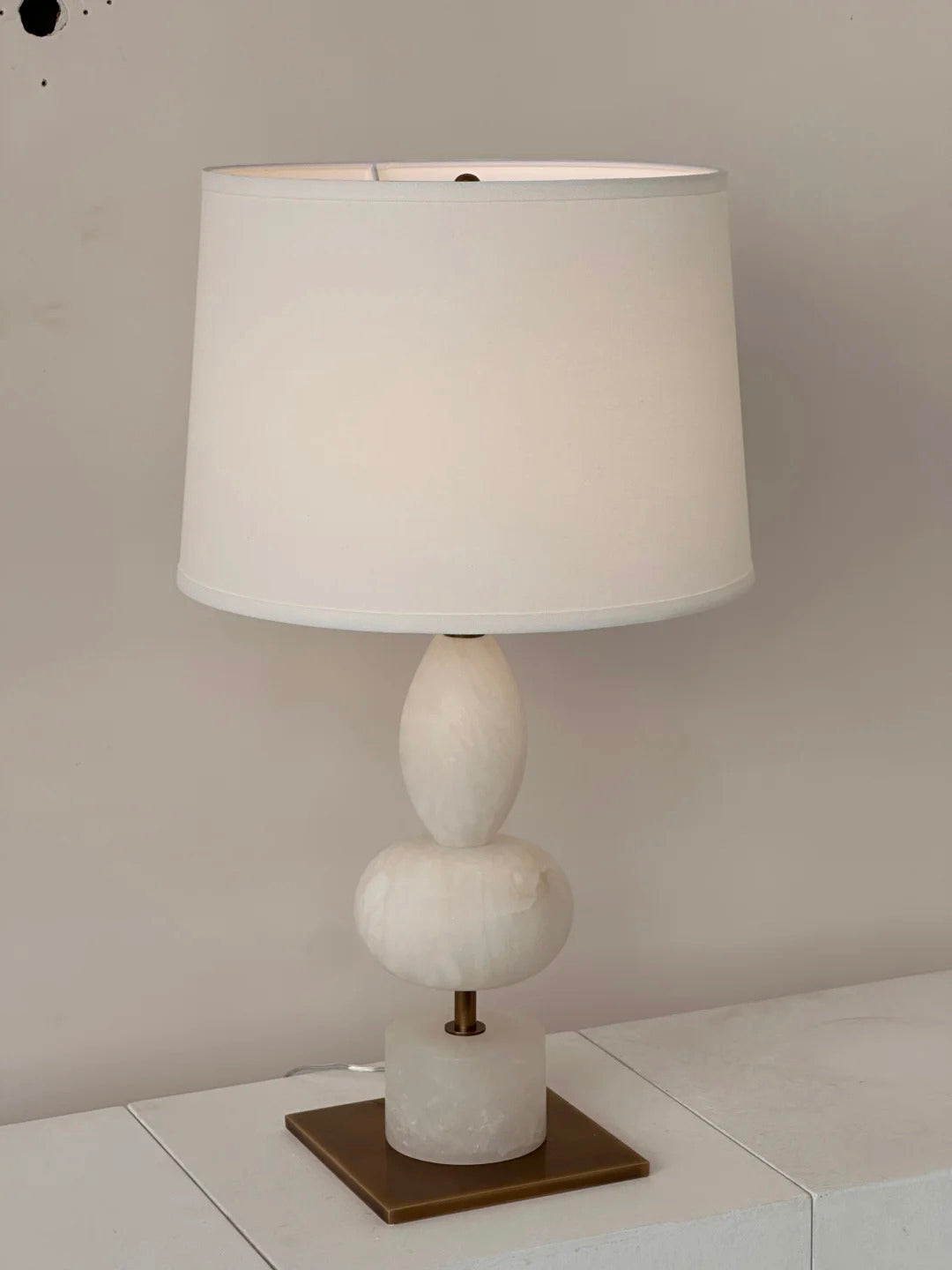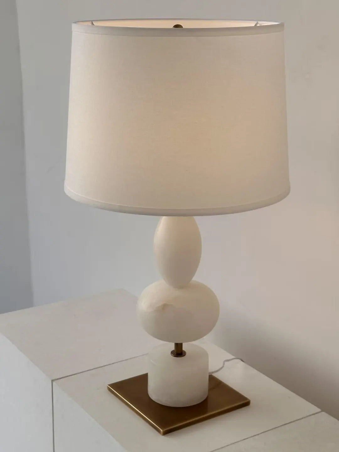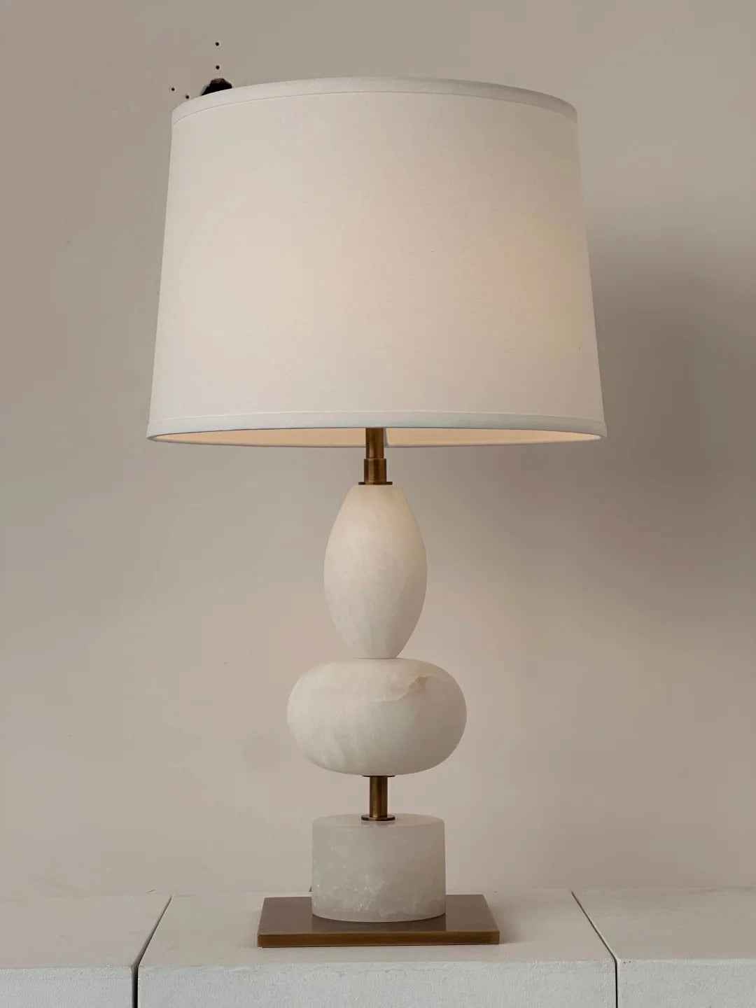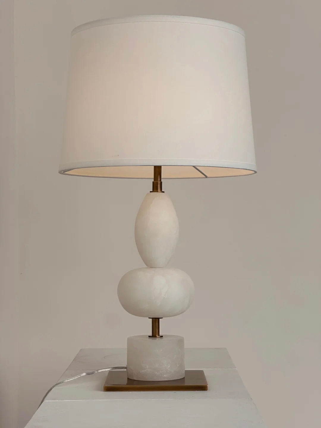 - The design is a study in balanced contrast. The core of the lamp is composed of irregularly stacked oval forms, reminiscent of stones naturally piled over time. This organic, almost casual structure is intentionally juxtaposed with a solid, square alabaster base. This clever geometry introduces a distinctly modern, architectural aesthetic, ensuring the piece feels both timeless and completely contemporary. It is this dialogue between the irregular and the structured, the organic and the geometric, that gives the Dani Lamp its captivating character.