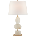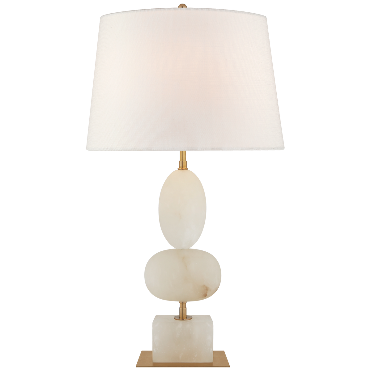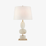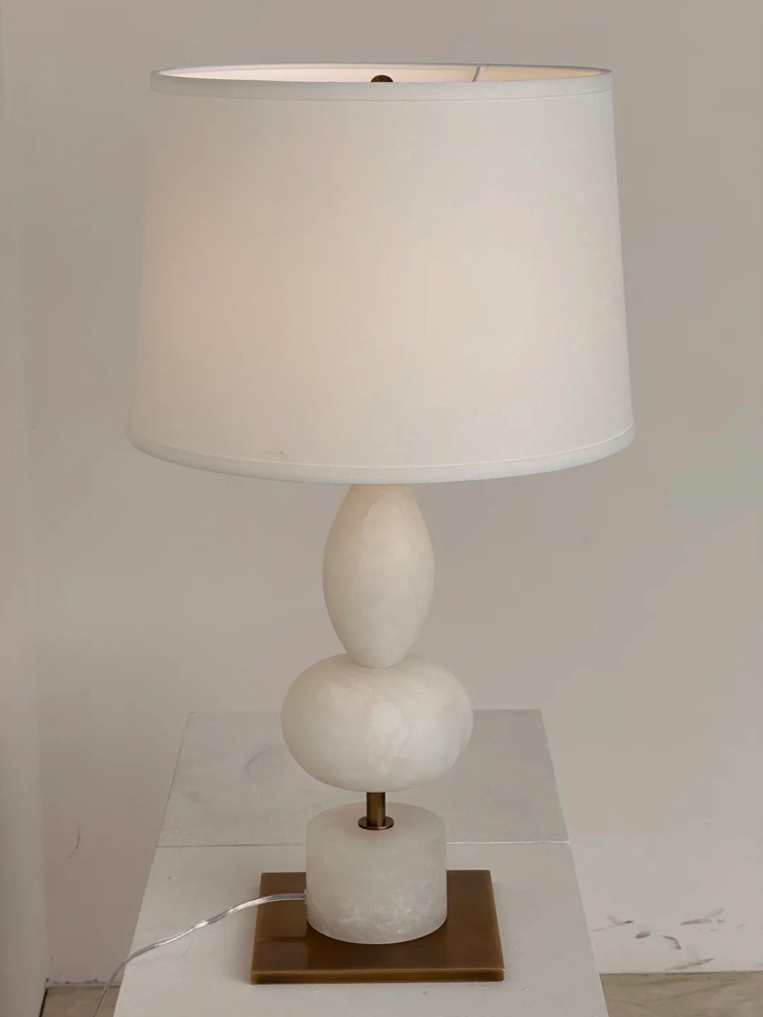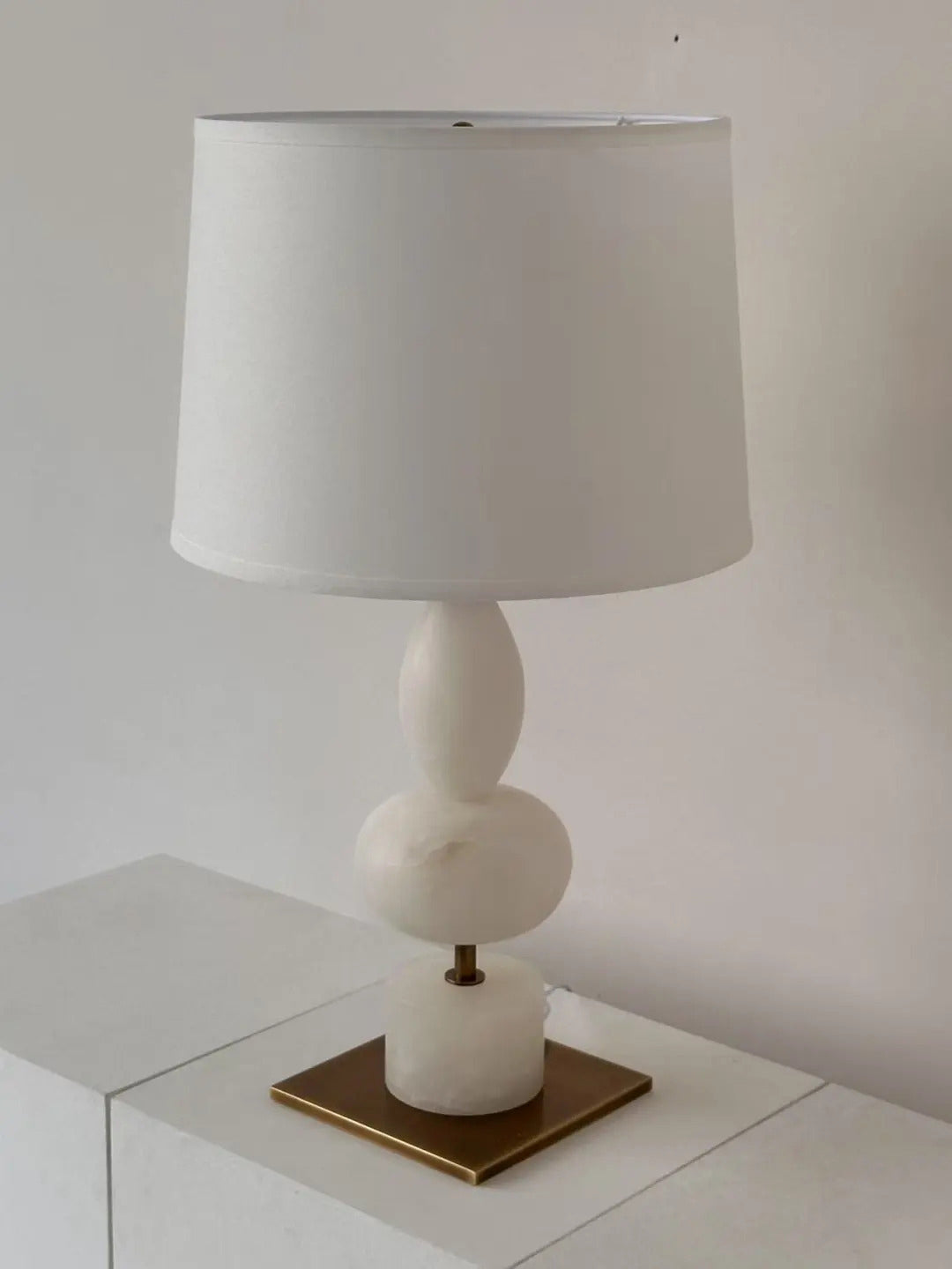- The design is a study in balanced contrast. The core of the lamp is composed of irregularly stacked oval forms, reminiscent of stones naturally piled over time. This organic, almost casual structure is intentionally juxtaposed with a solid, square alabaster base. This clever geometry introduces a distinctly modern, architectural aesthetic, ensuring the piece feels both timeless and completely contemporary. It is this dialogue between the irregular and the structured, the organic and the geometric, that gives the Dani Lamp its captivating character.