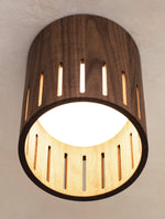 - Elevate your space with the Drum Flush Mount Light, a masterful blend of solid wood and sleek glass. This unique fixture bathes your room in a soft, even glow while adding a touch of organic, artisanal style. Perfect for creating a cozy and inviting atmosphere.