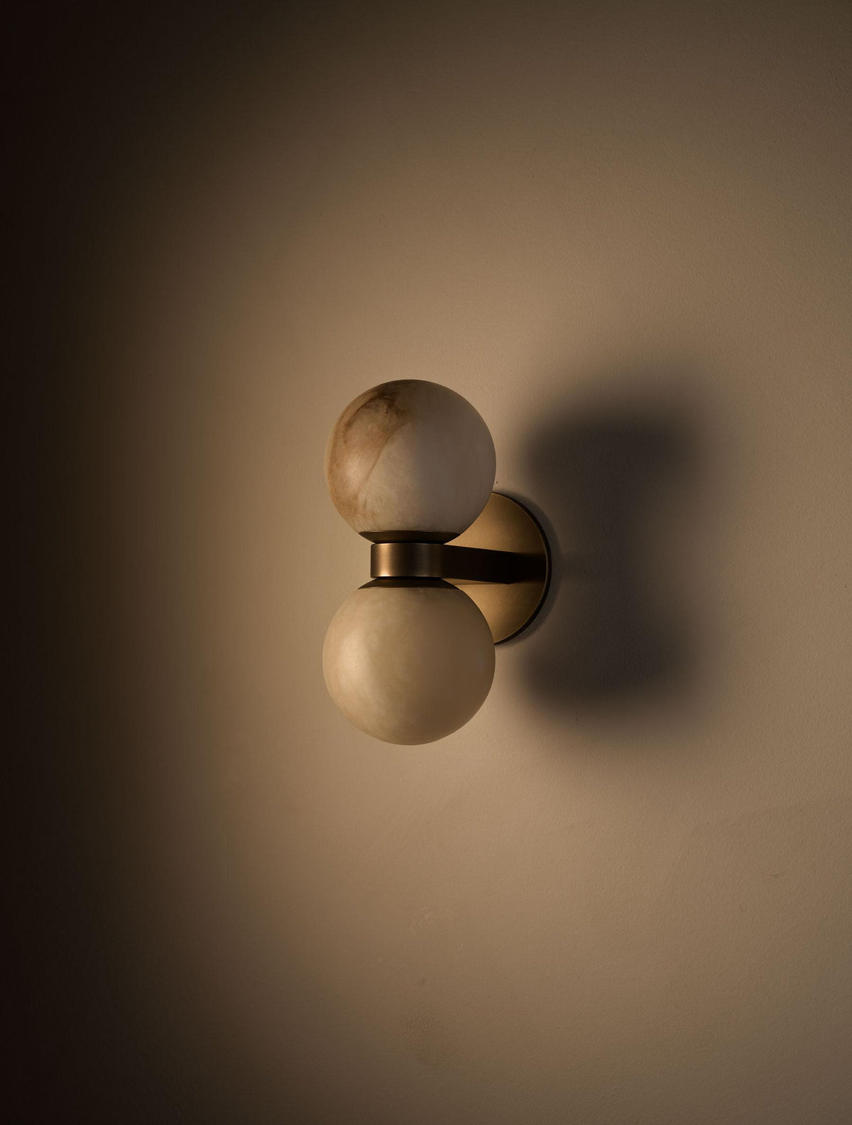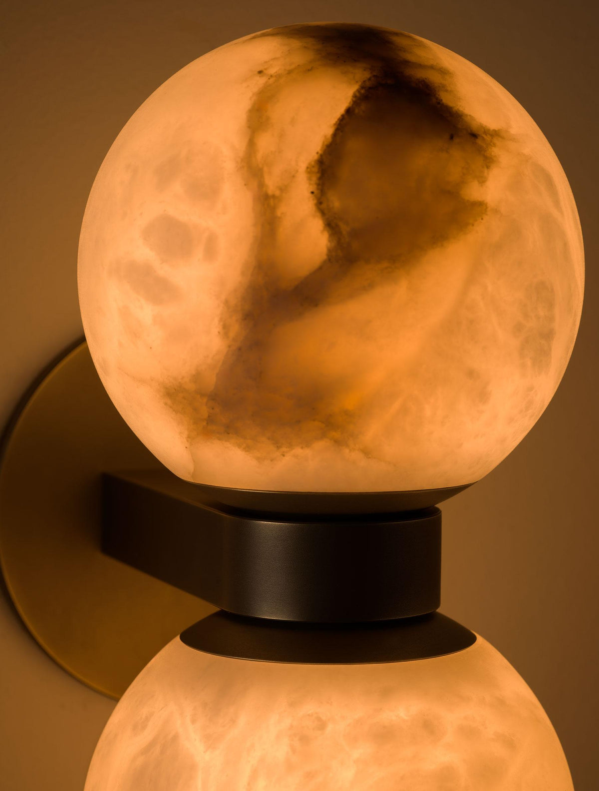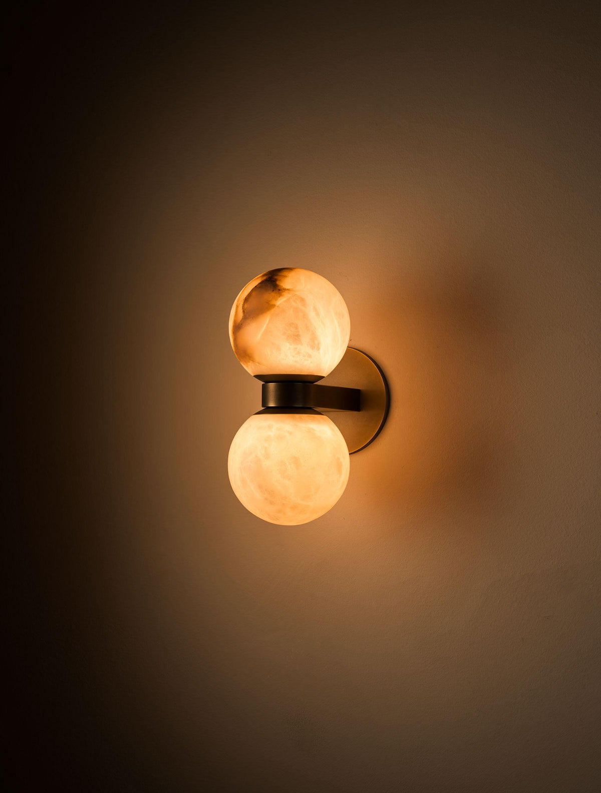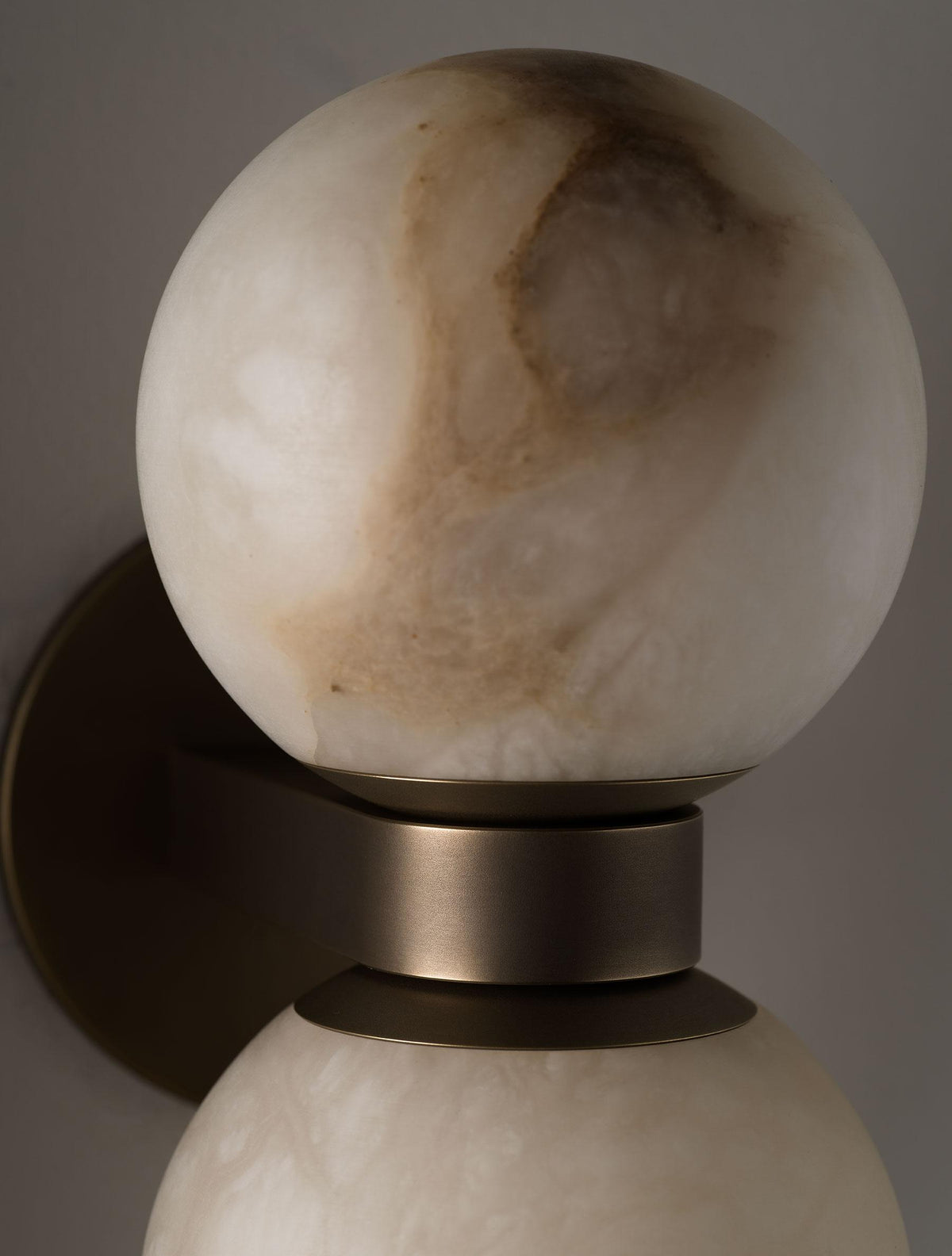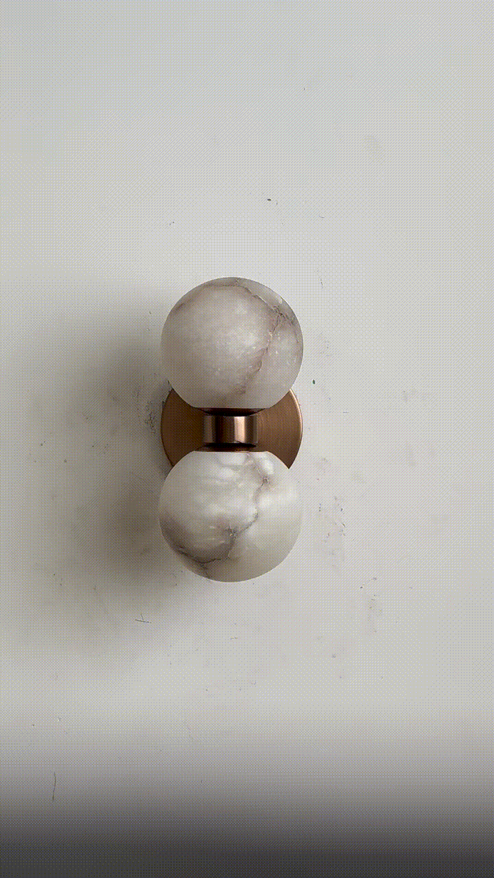- Enhance your space with the Dual Globe Wall Sconce, a harmonious blend of modern design and timeless elegance. Featuring two handcrafted alabaster globes placed symmetrically on either side of a sleek brass stand, this wall lamp emits a soft, even ambient light that creates a warm and inviting atmosphere.