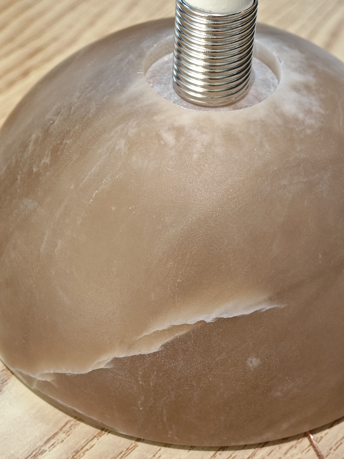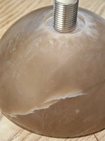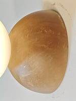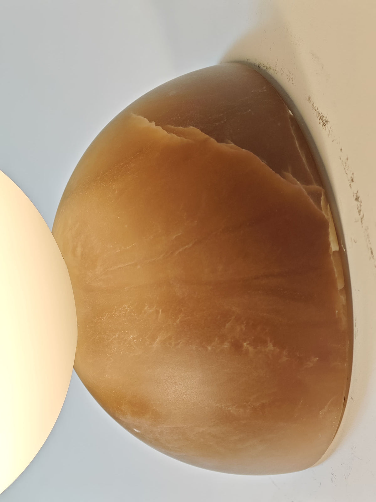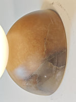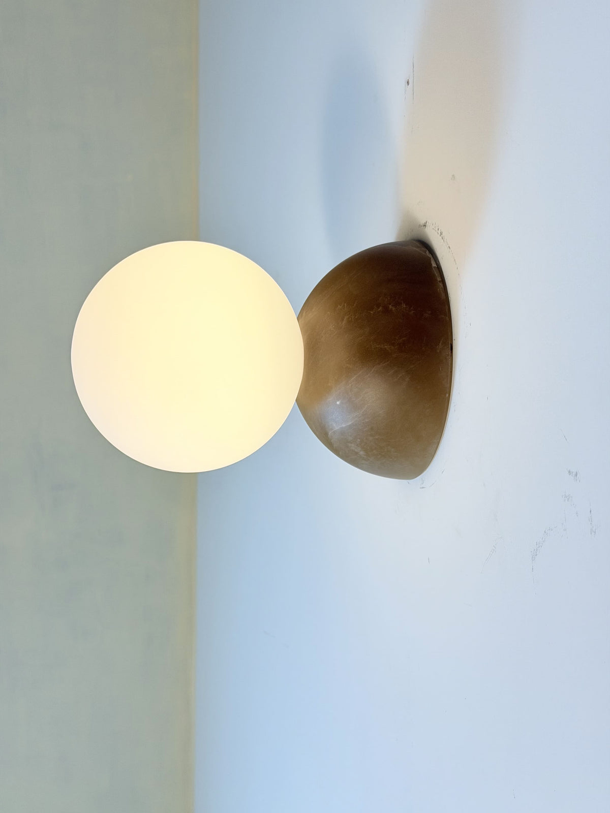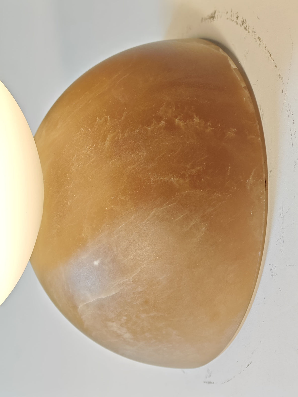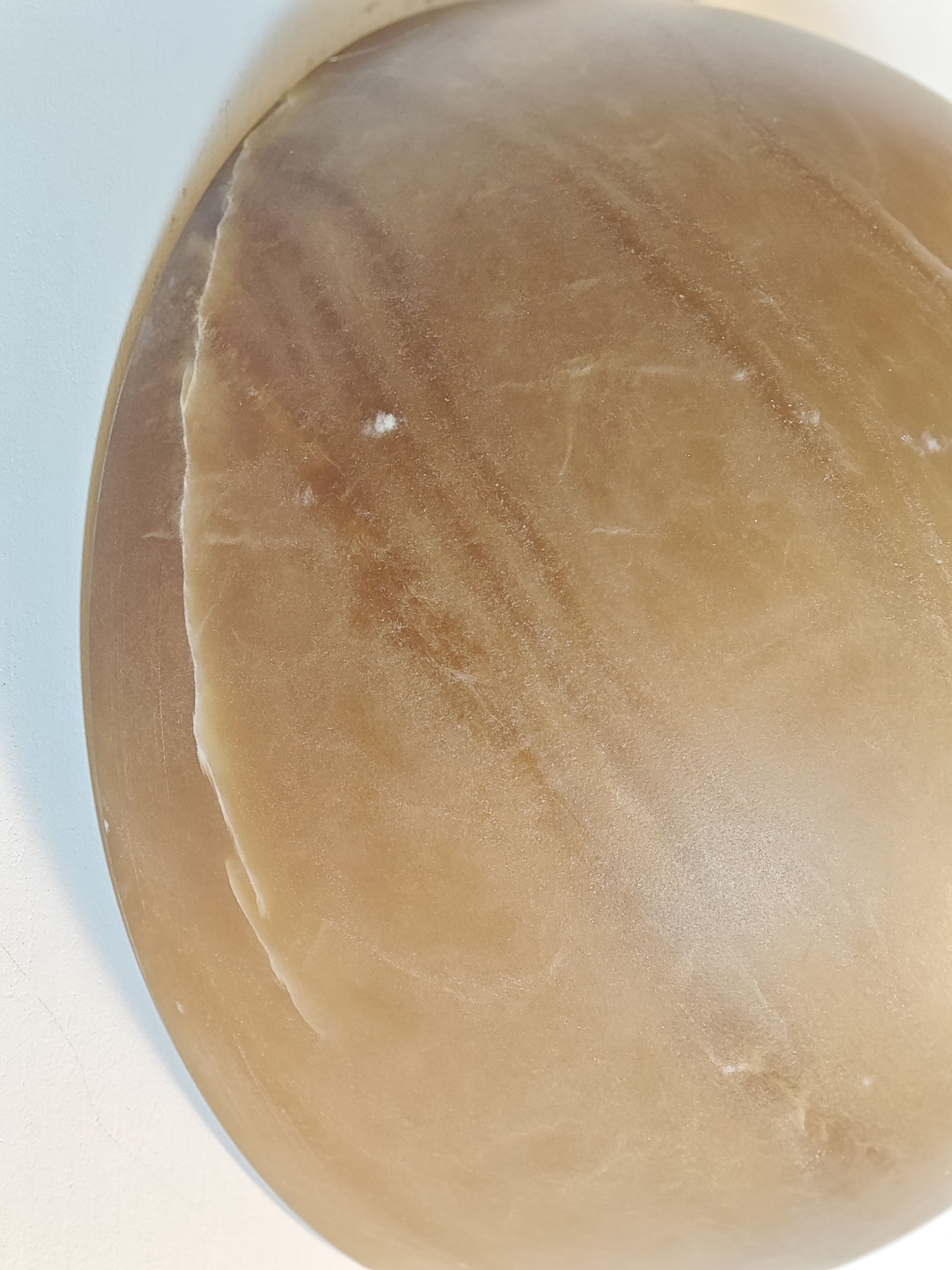 - The substantial backplate is crafted from exquisite Tobacco Alabaster, imported directly from Spain. This premium natural stone is rich with unique swirls of caramel, brown, and cream—a depth of color that gives the material its distinct "flavor."