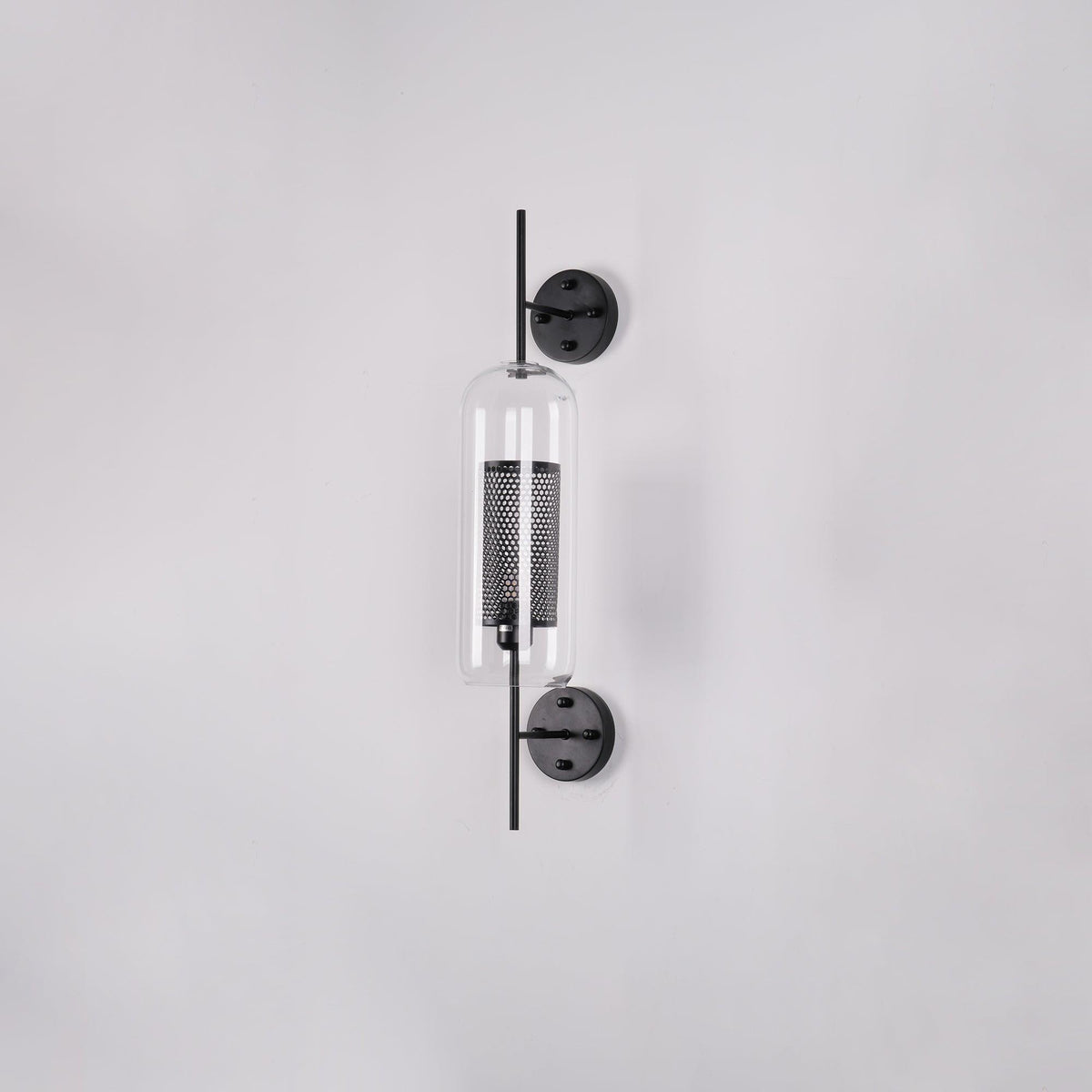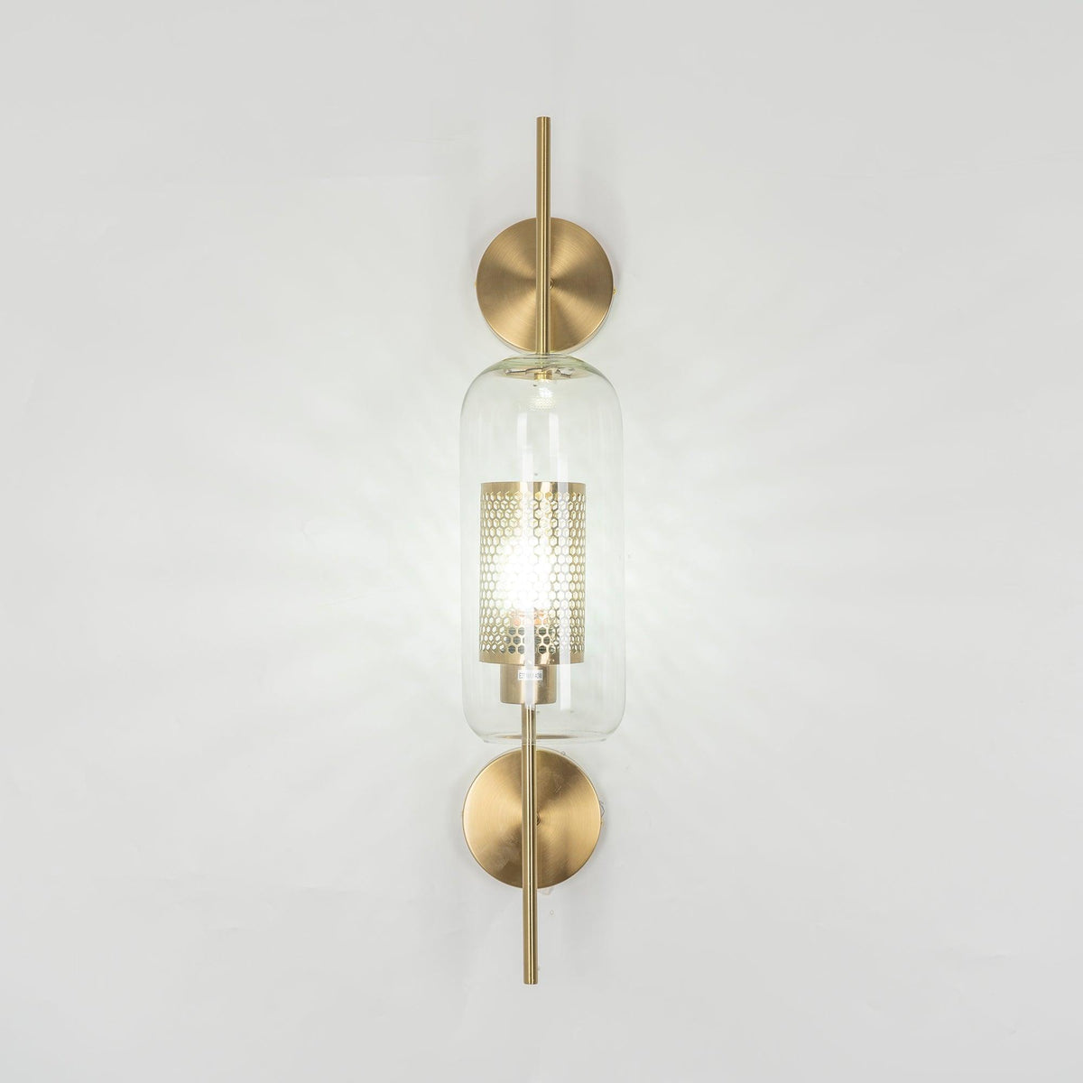 - The design of Emerson Glass Wall Sconce is layered with a wire mesh shrouded bulb surrounded by a glass shade gathered together to stop some of the dust from getting in. The glass is available in two colors, making the right choice to match to fill the space.