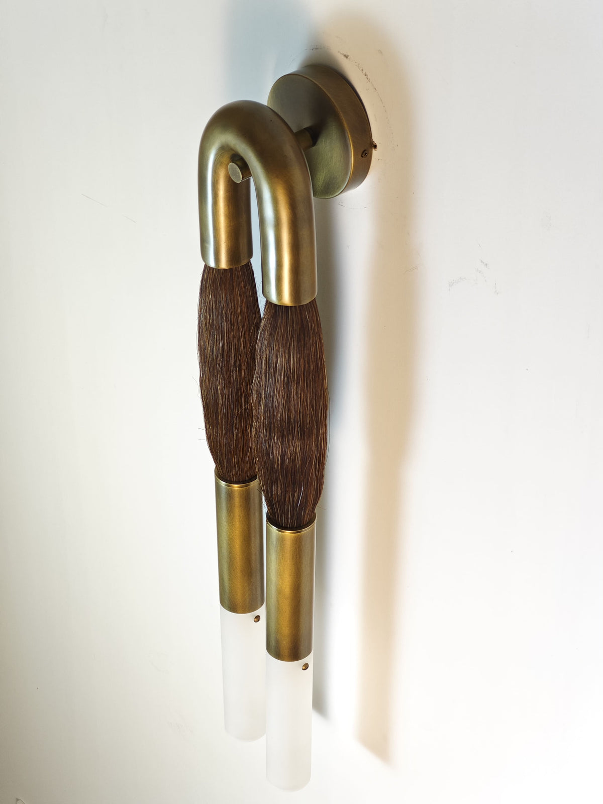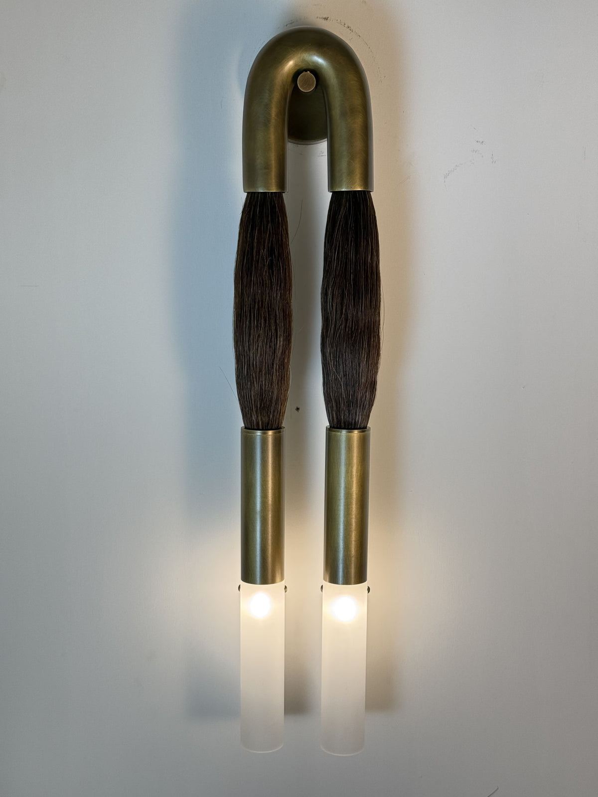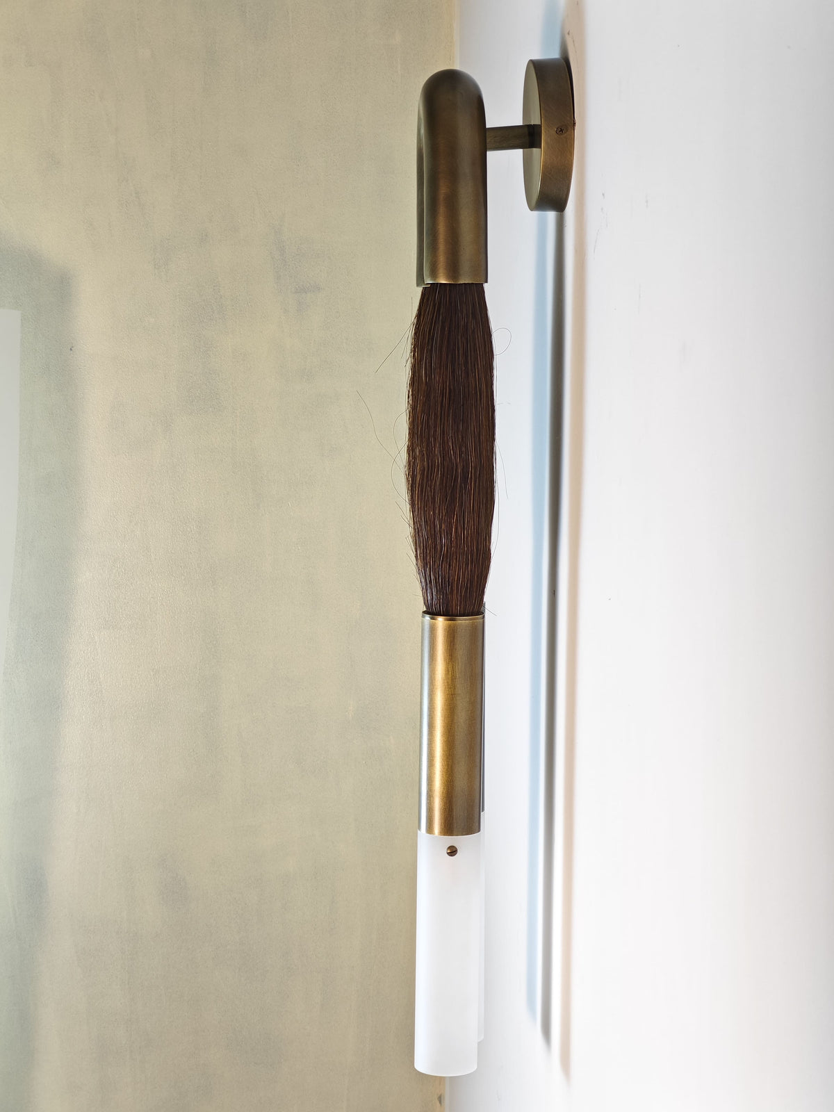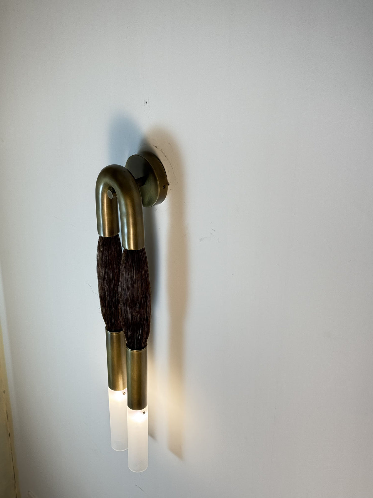 - Elevate your space with the Horsehair Sconce, a captivating blend of organic texture and refined craftsmanship. Tightly woven wefts of horsehair suggest structural integrity, while the gracefully draped brass form—cast to appear casually slung over a peg—adds an artful, effortless charm.