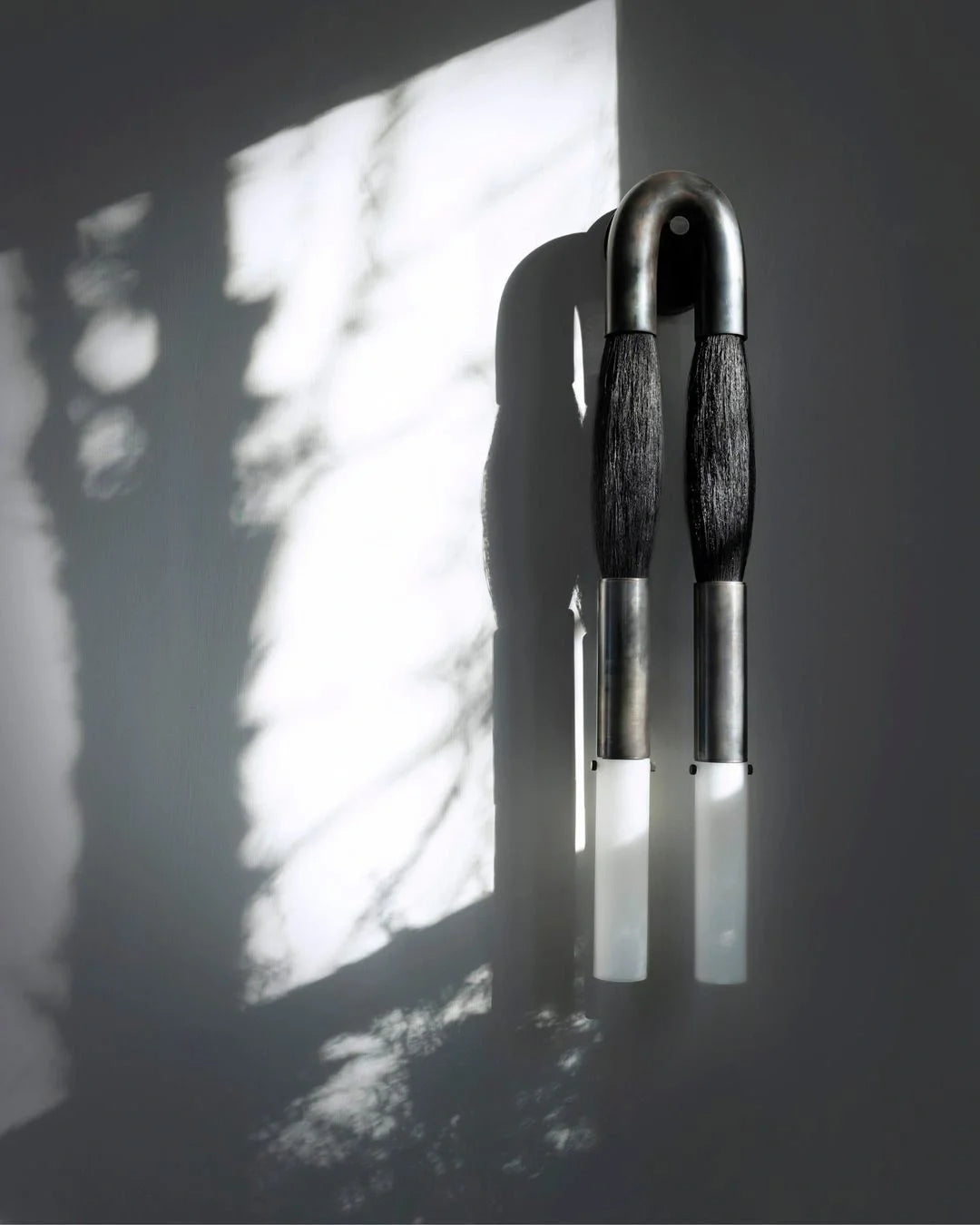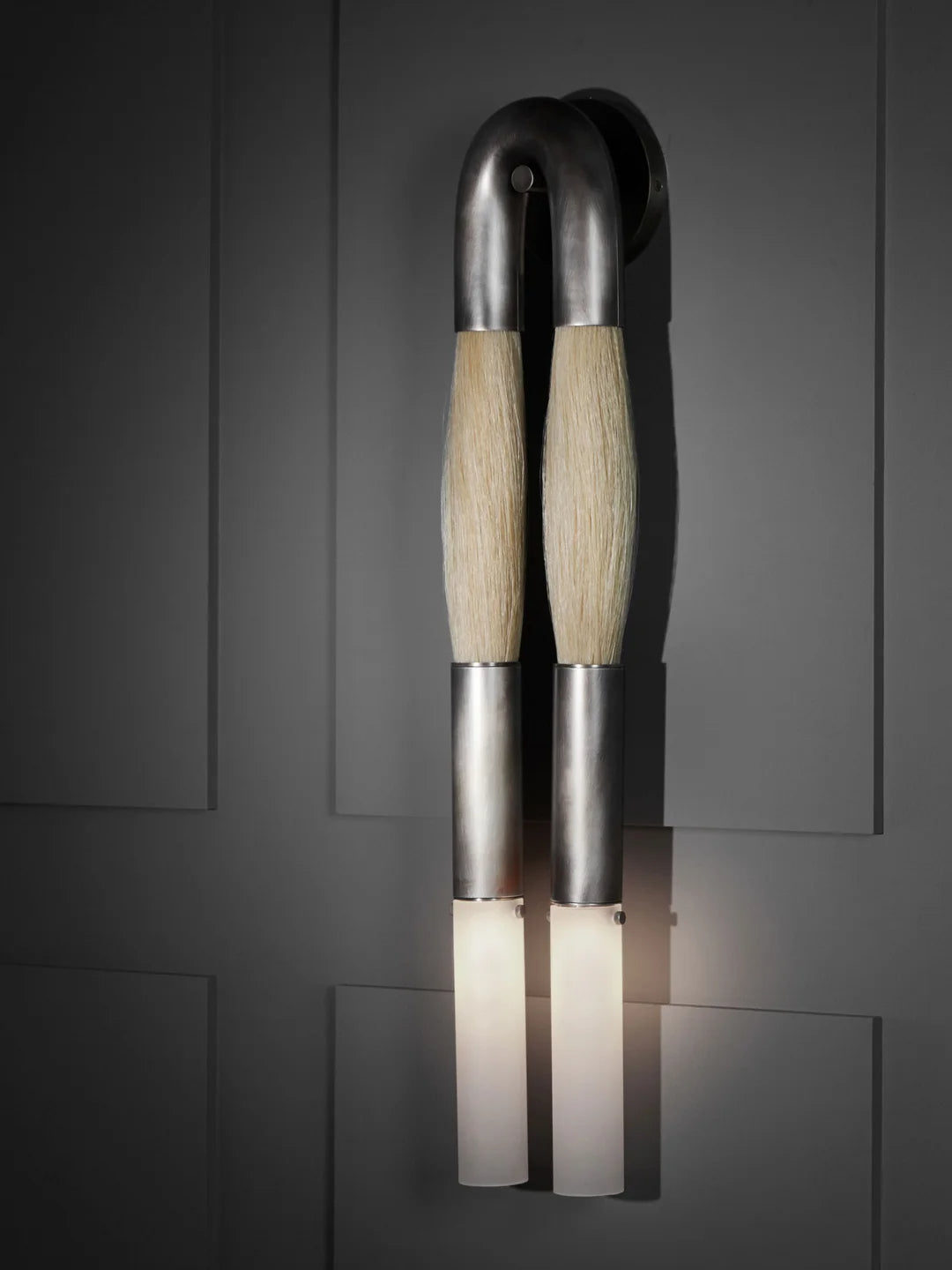 - This unique wall sconce merges raw, natural material with sleek metallic detailing, creating a striking contrast that enhances both modern and rustic interiors. The interplay of light through the horsehair weave casts delicate shadows, adding depth and ambiance to any room.