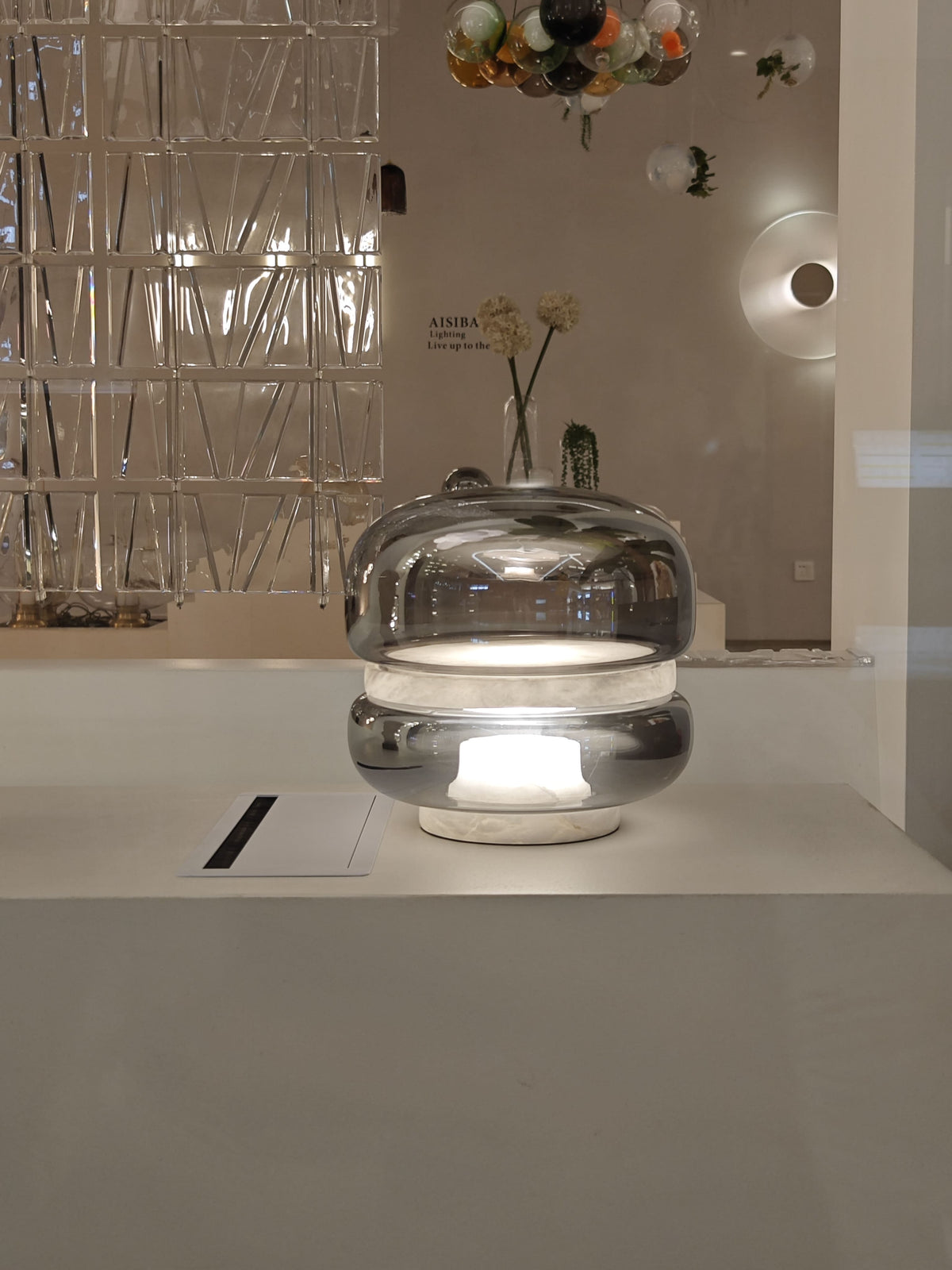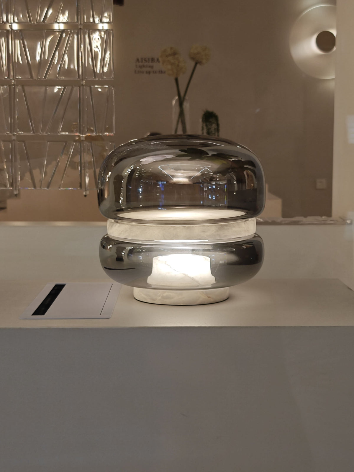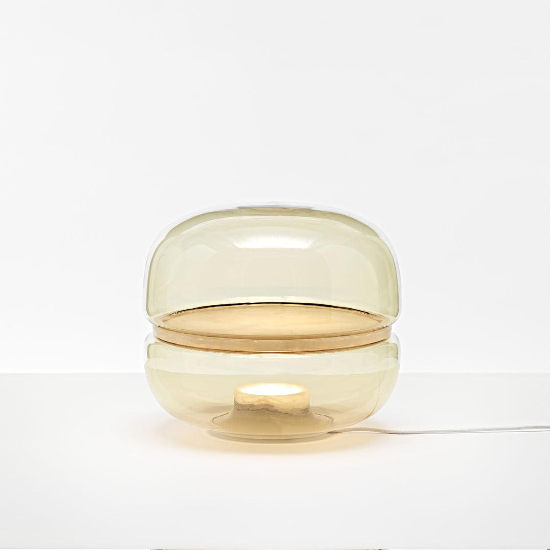 - The "Macaron" name aptly describes the lamp's elegant, double-domed form, reminiscent of the beloved French confection. Each piece is a unique creation, celebrating the natural variations in the stone and the subtle imperfections inherent in handblown glass.