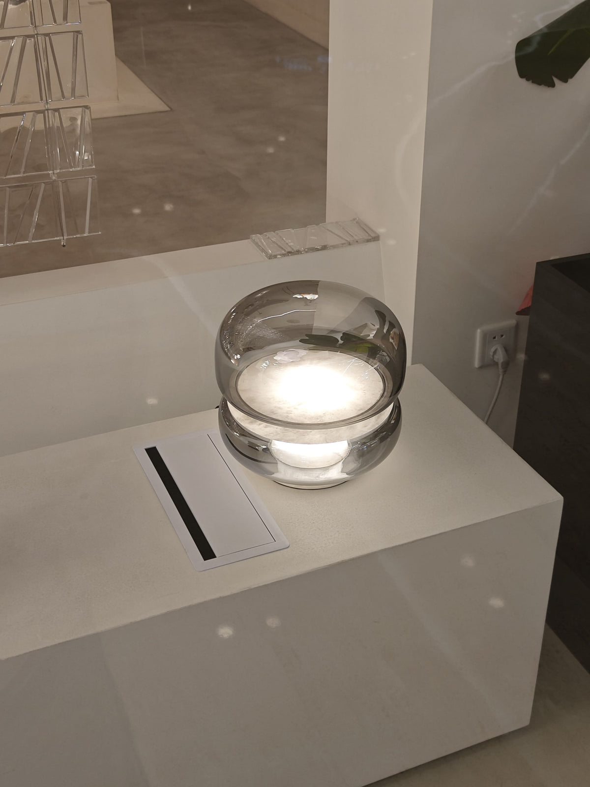 - The Macaron Table Lamp draws inspiration from the ethereal beauty of crystalline stone. Enclosed within a pair of delicate, handblown glass domes, the centerpiece – a mesmerizing slice of chalcedony – appears to float like a celestial body within its own miniature cosmos.
