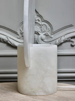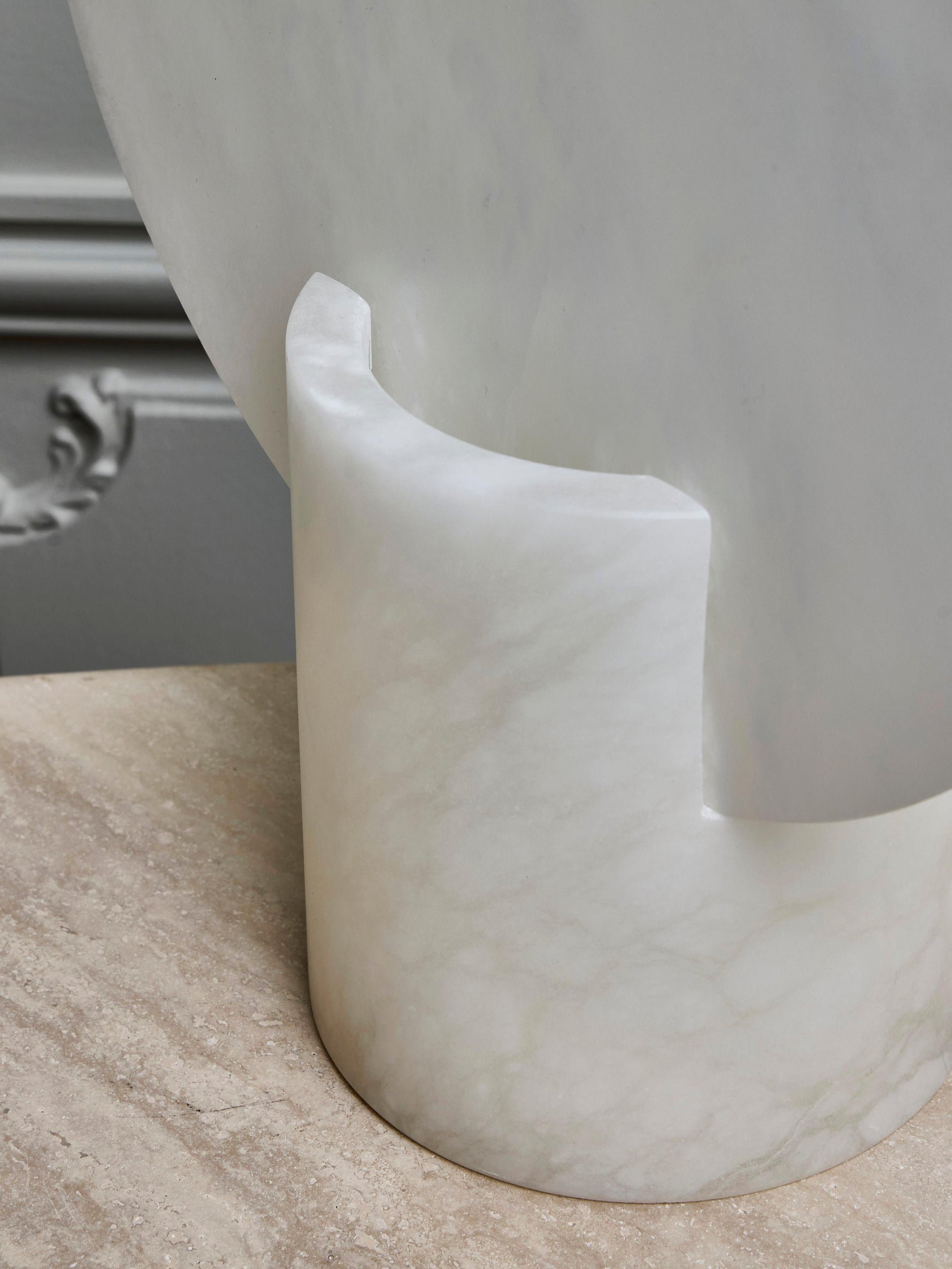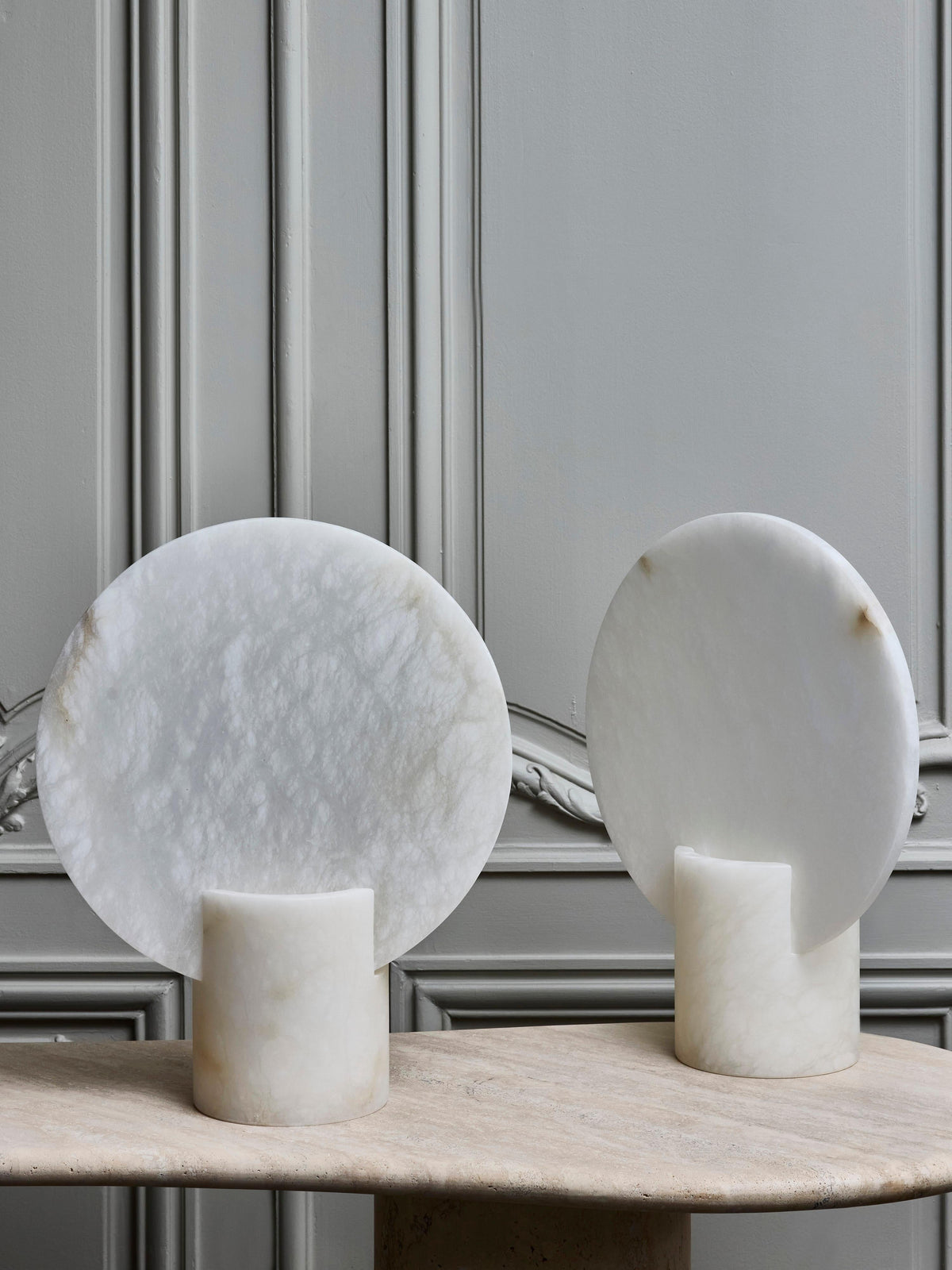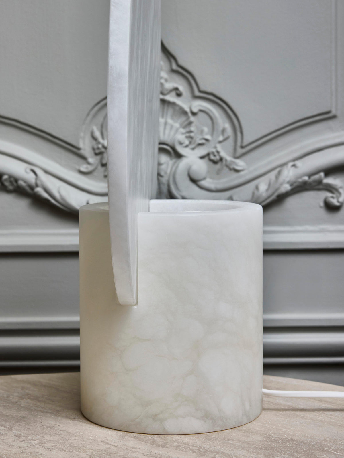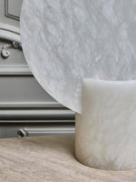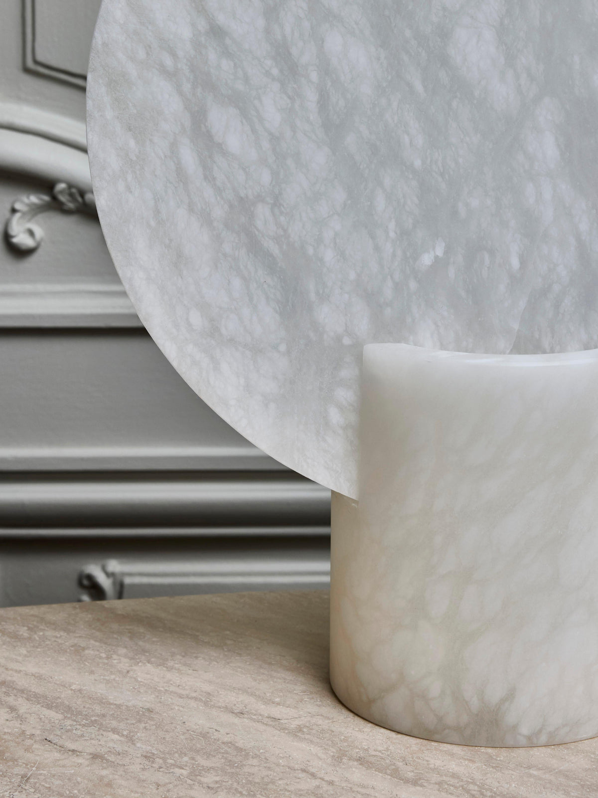 - Embrace minimalist elegance with our Alabaster Screen Table Lamp. Each lamp features a unique cylindrical base with clean, vertical slots, crowned by a large, standing round diffuser. This sculptural design casts beautiful, ambient light, creating a serene and sophisticated atmosphere in any room. Perfect for flanking a bed, sofa, or console table.