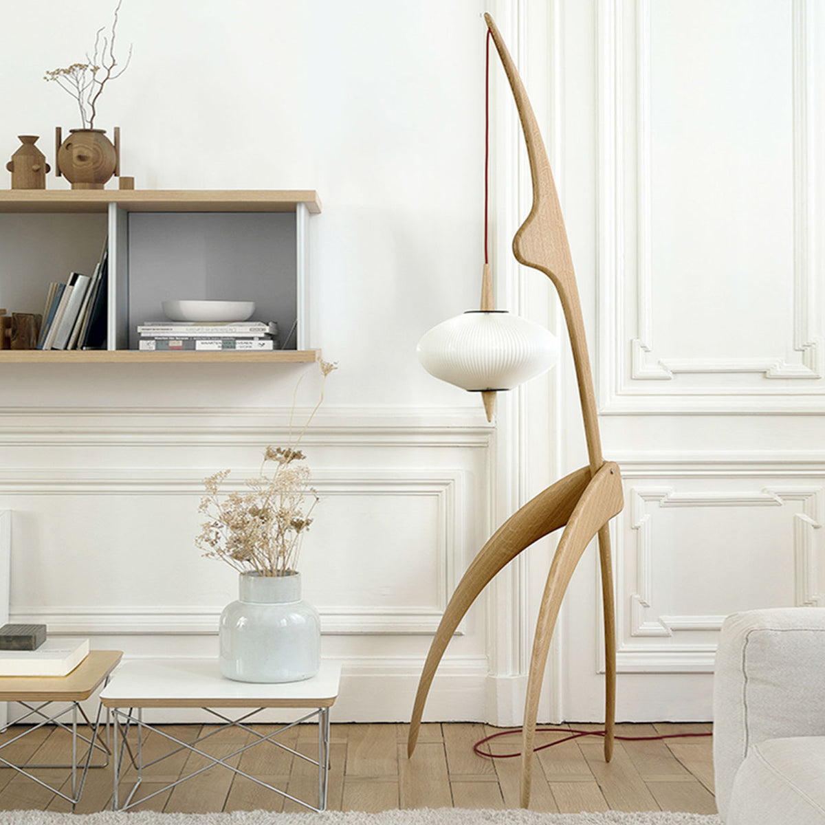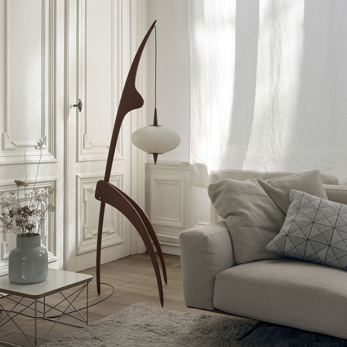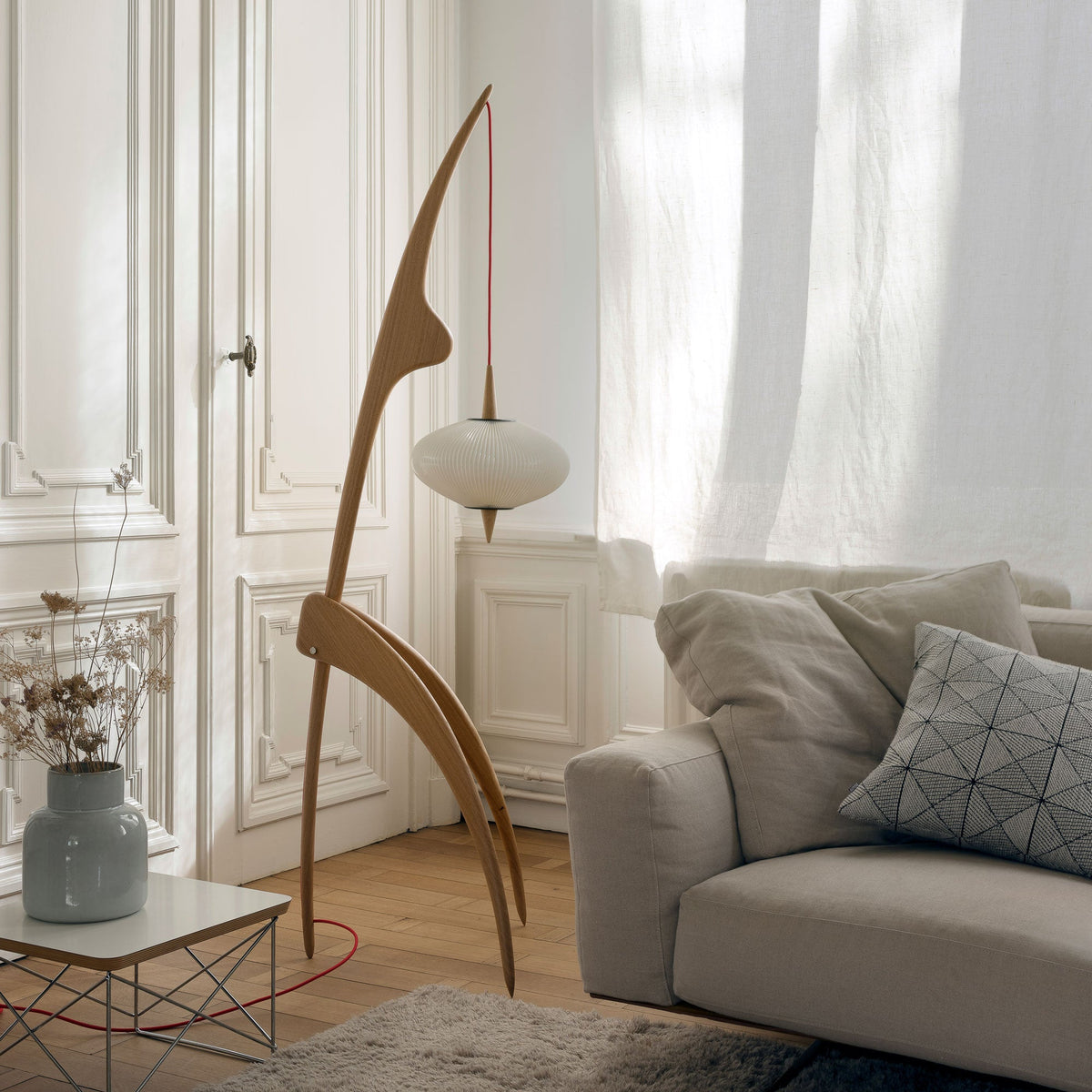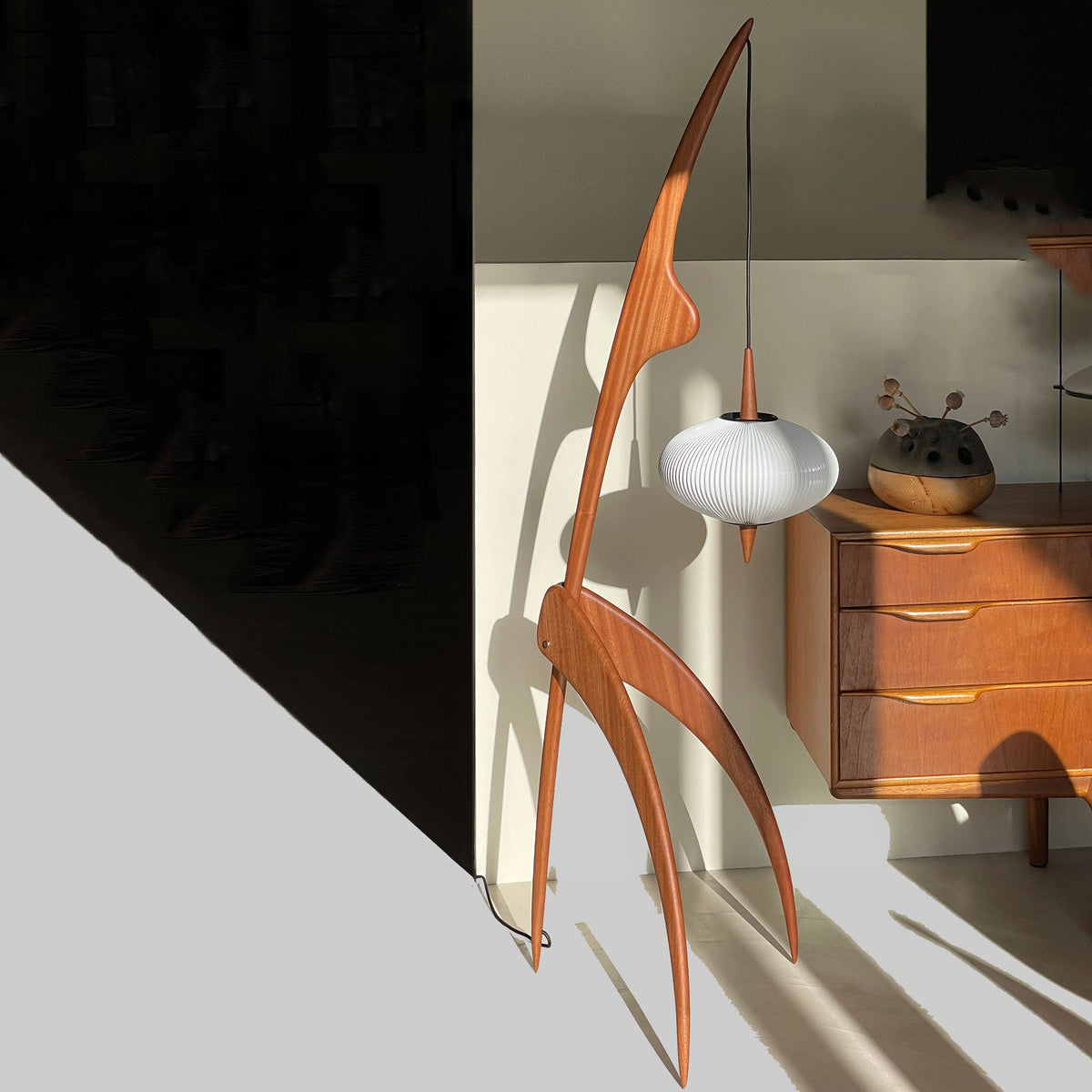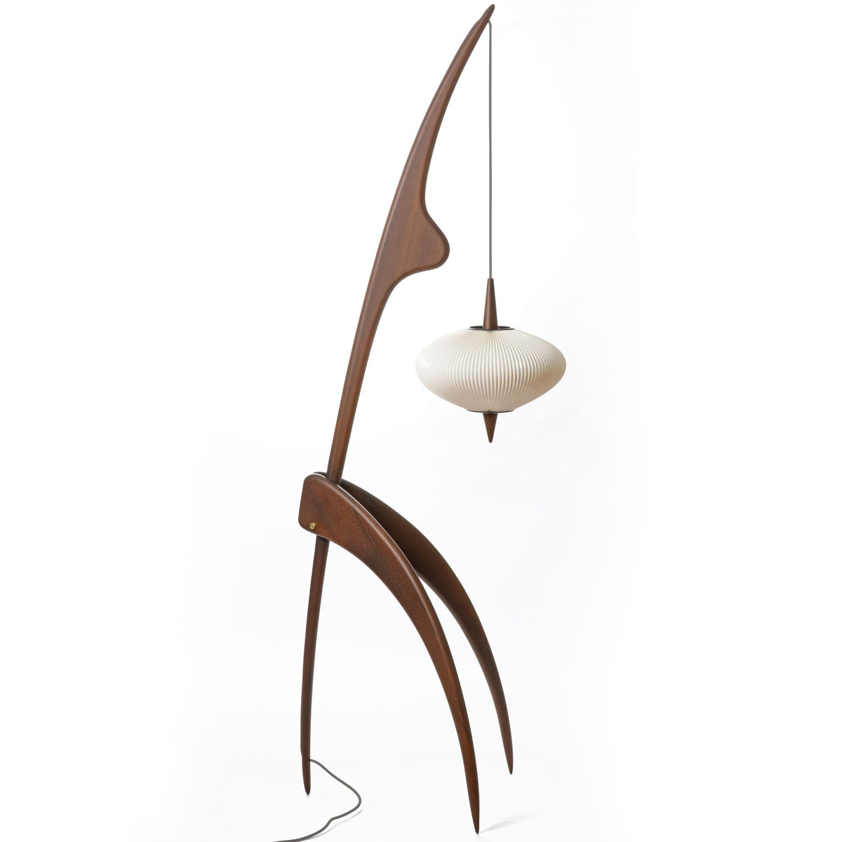 - The Praying Mantis Floor Lamp is an American version of the classic mid-century French design by Francois Rispal. Named after La Mante Religieuse, or the Praying Mantis, this piece features beautifully arched legs with a pleated white lamp shade made from similar, but updated, materials that could be found in the 1950s. The structure is made from wood and is crafted by hand. The floor lamp can be used for ambient lighting in office or living spaces.