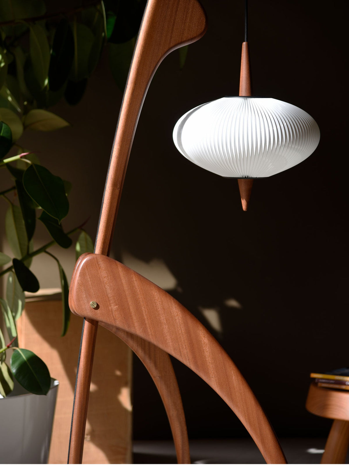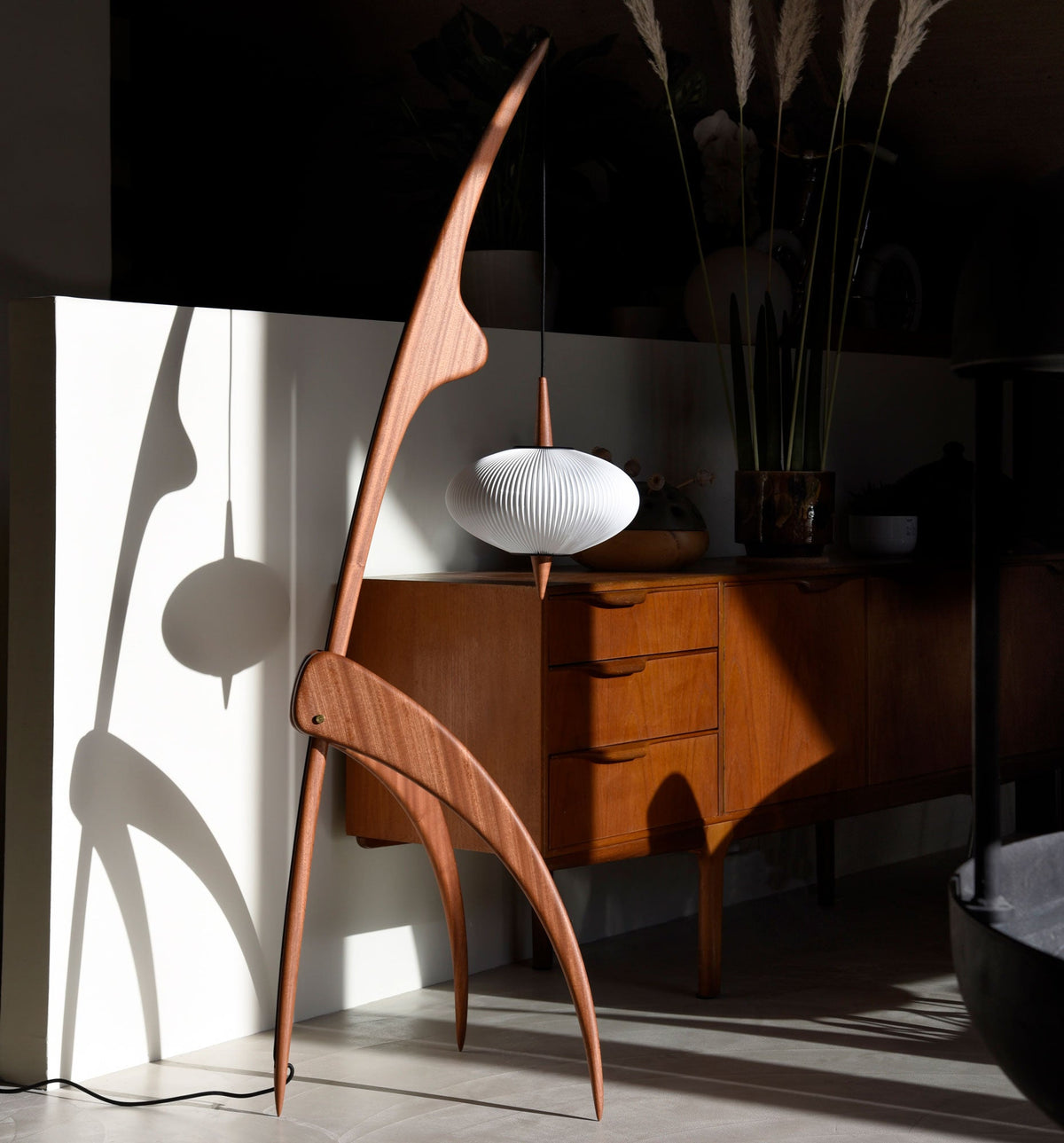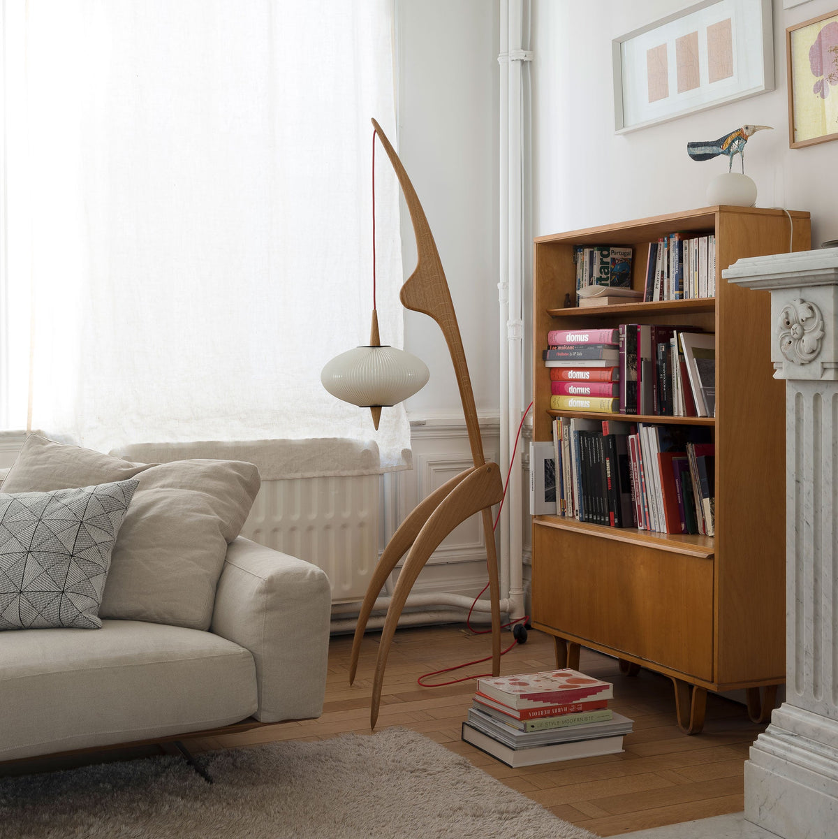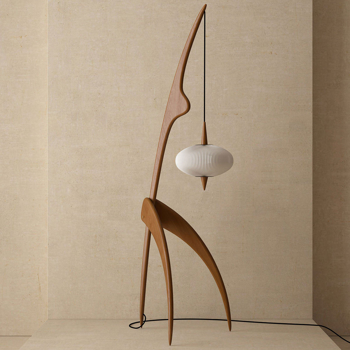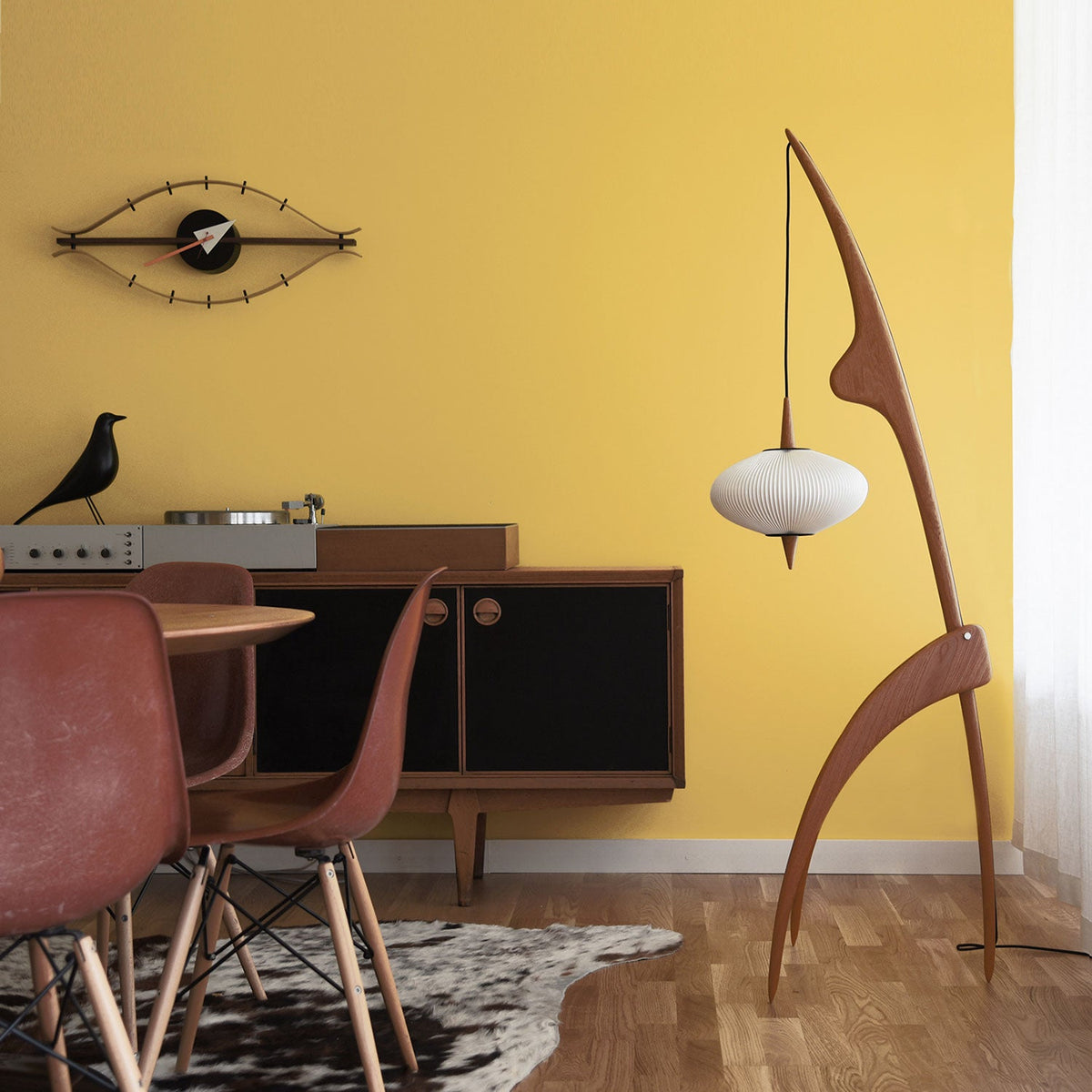 - The Praying Mantis Floor Lamp is an American version of the classic mid-century French design by Francois Rispal. Named after La Mante Religieuse, or the Praying Mantis, this piece features beautifully arched legs with a pleated white lamp shade made from similar, but updated, materials that could be found in the 1950s. The structure is made from wood and is crafted by hand. The floor lamp can be used for ambient lighting in office or living spaces.