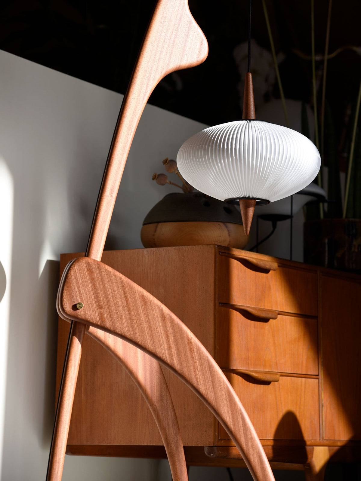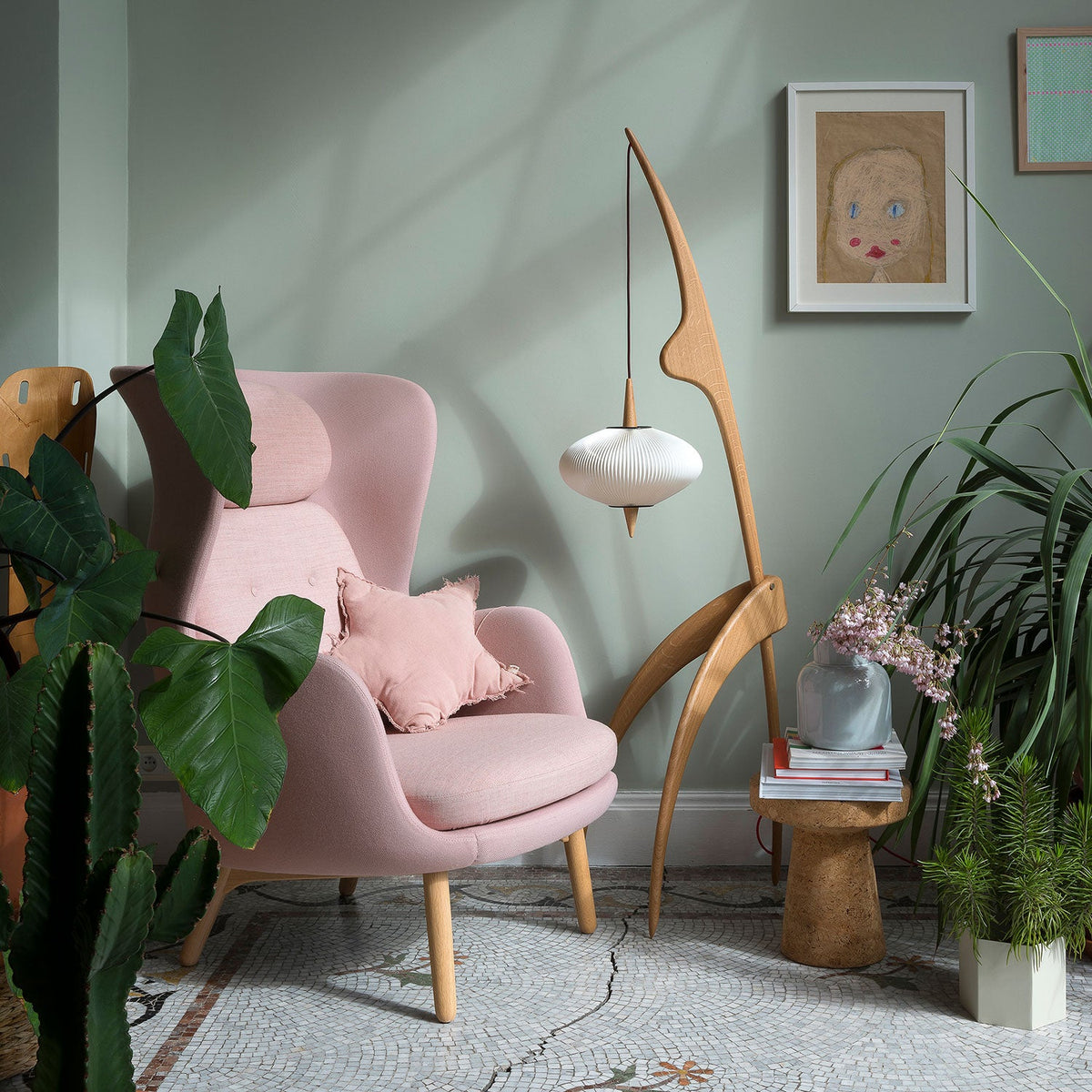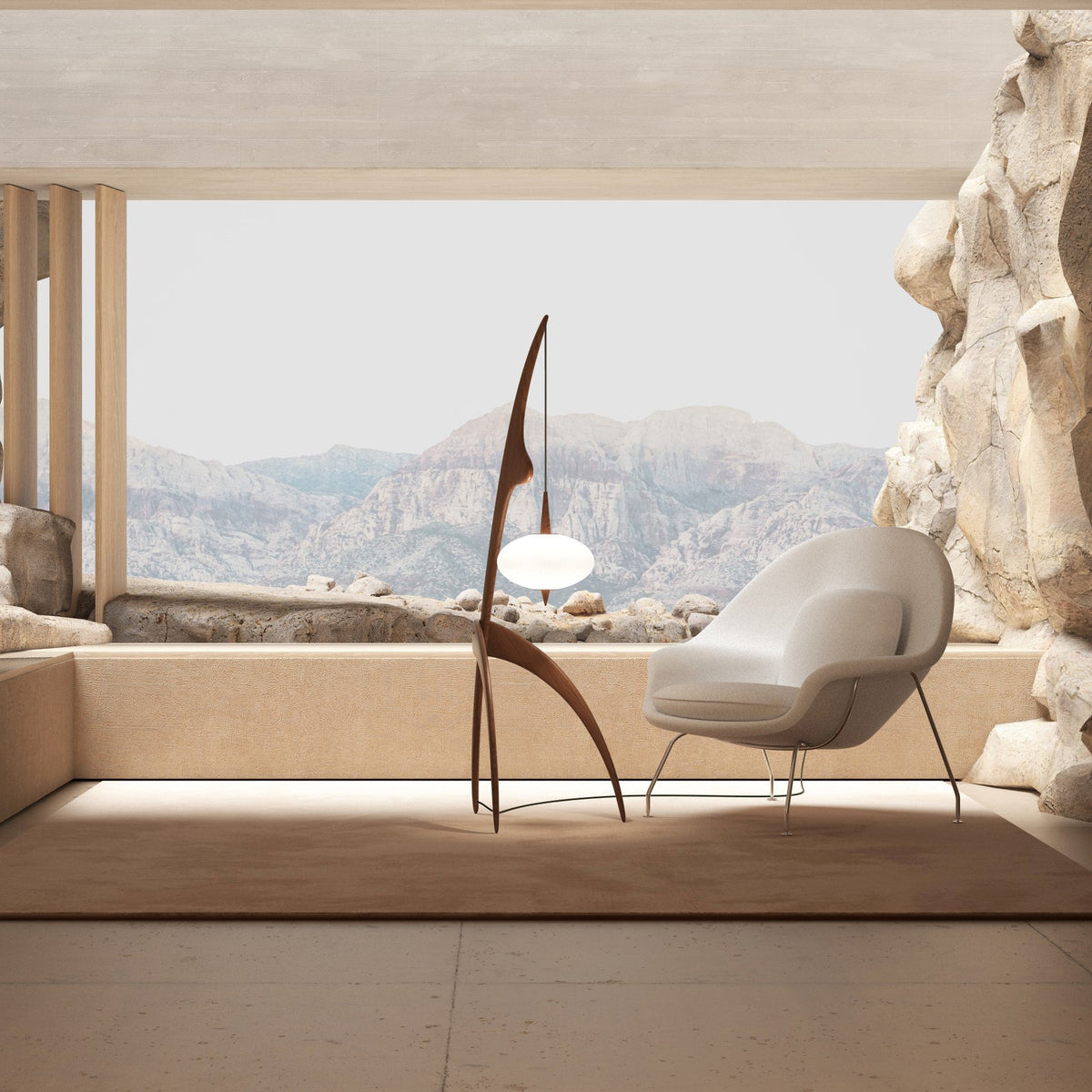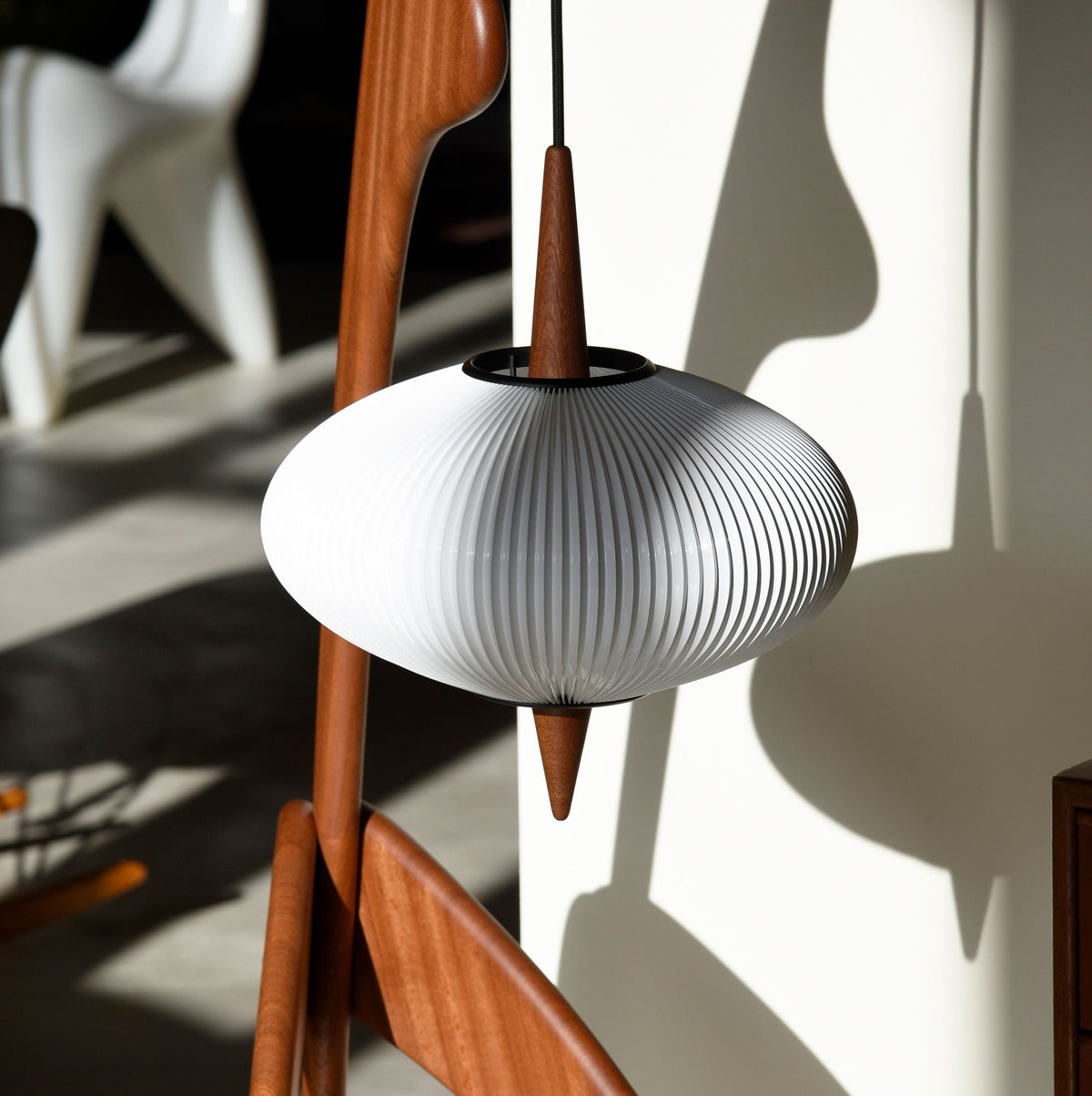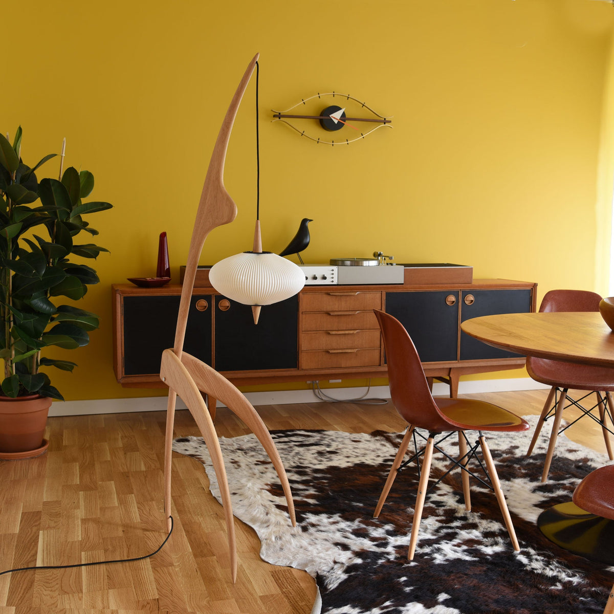 - The Praying Mantis Floor Lamp is an American version of the classic mid-century French design by Francois Rispal. Named after La Mante Religieuse, or the Praying Mantis, this piece features beautifully arched legs with a pleated white lamp shade made from similar, but updated, materials that could be found in the 1950s. The structure is made from wood and is crafted by hand. The floor lamp can be used for ambient lighting in office or living spaces.